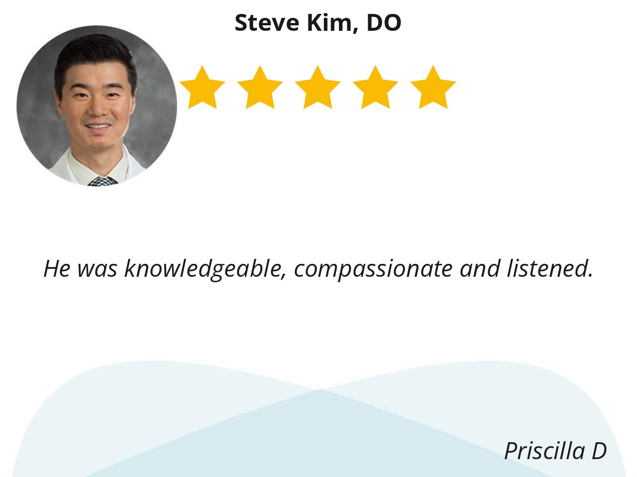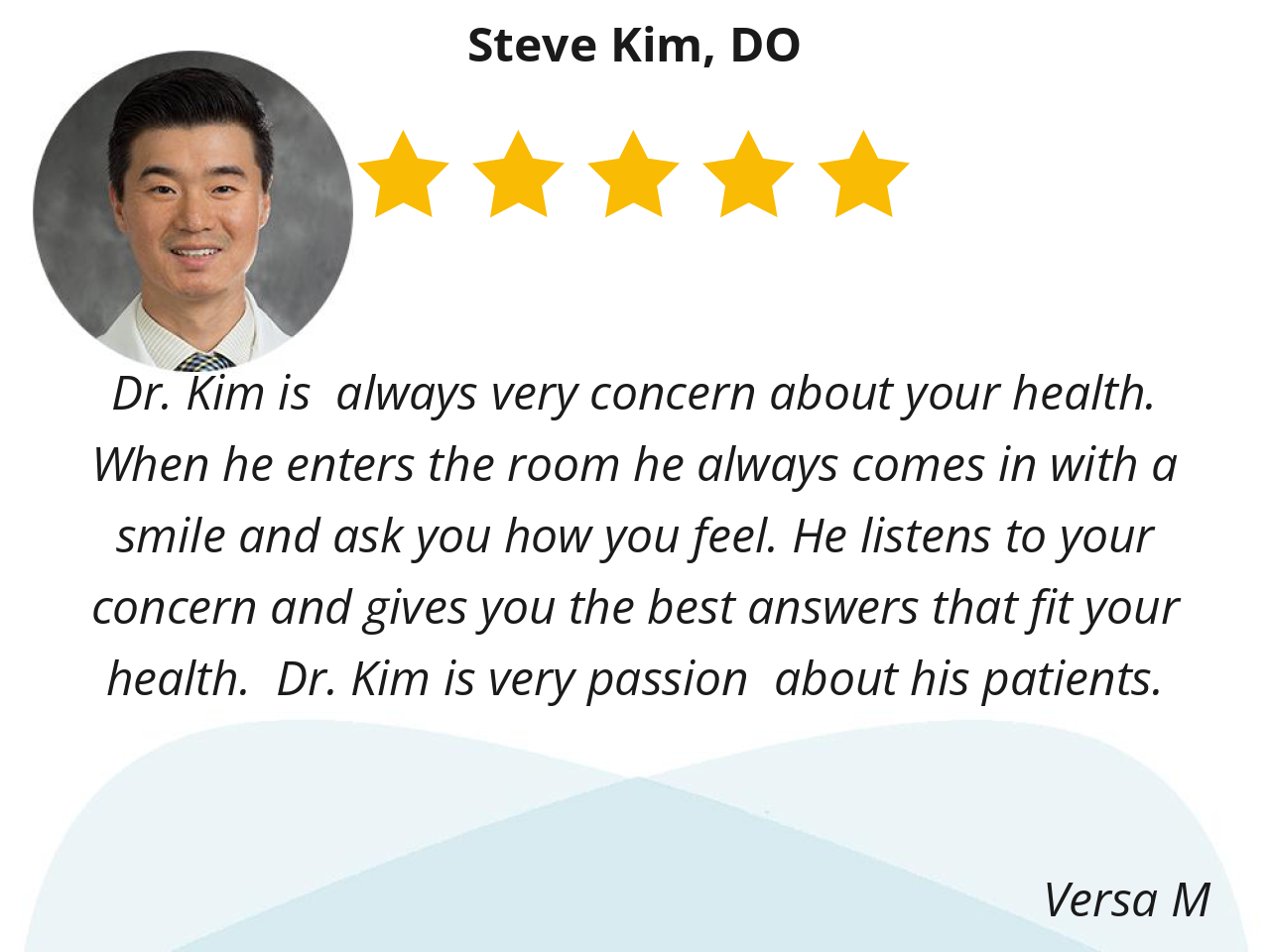 Dr. Kim is always very concern about your health. When he enters the room he always comes in with a smile and ask you how you feel. He listens to your concern and gives you the best answers that fit your health. Dr. Kim is very passion about his patients.