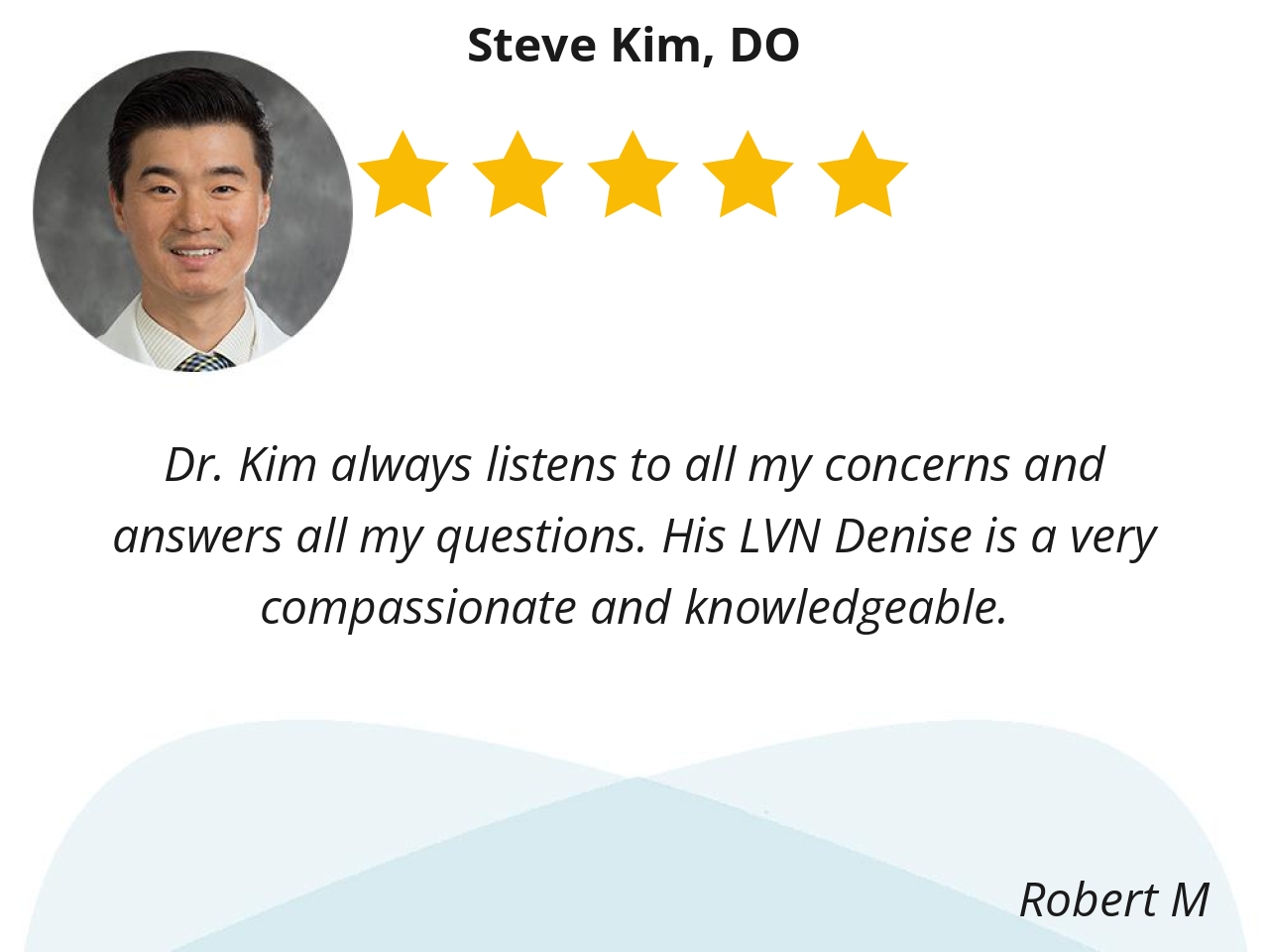 Dr. Kim always listens to all my concerns and answers all my questions. His LVN Denise is a very compassionate and knowledgeable.