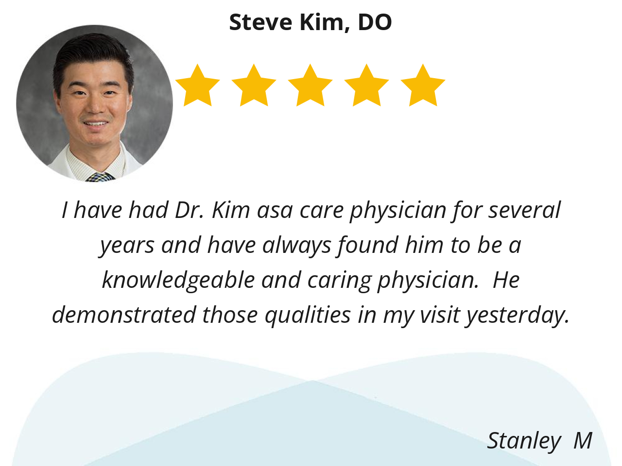 I have had Dr. Kim asa care physician for several years and have always found him to be a knowledgeable and caring physician. He demonstrated those qualities in my visit yesterday.