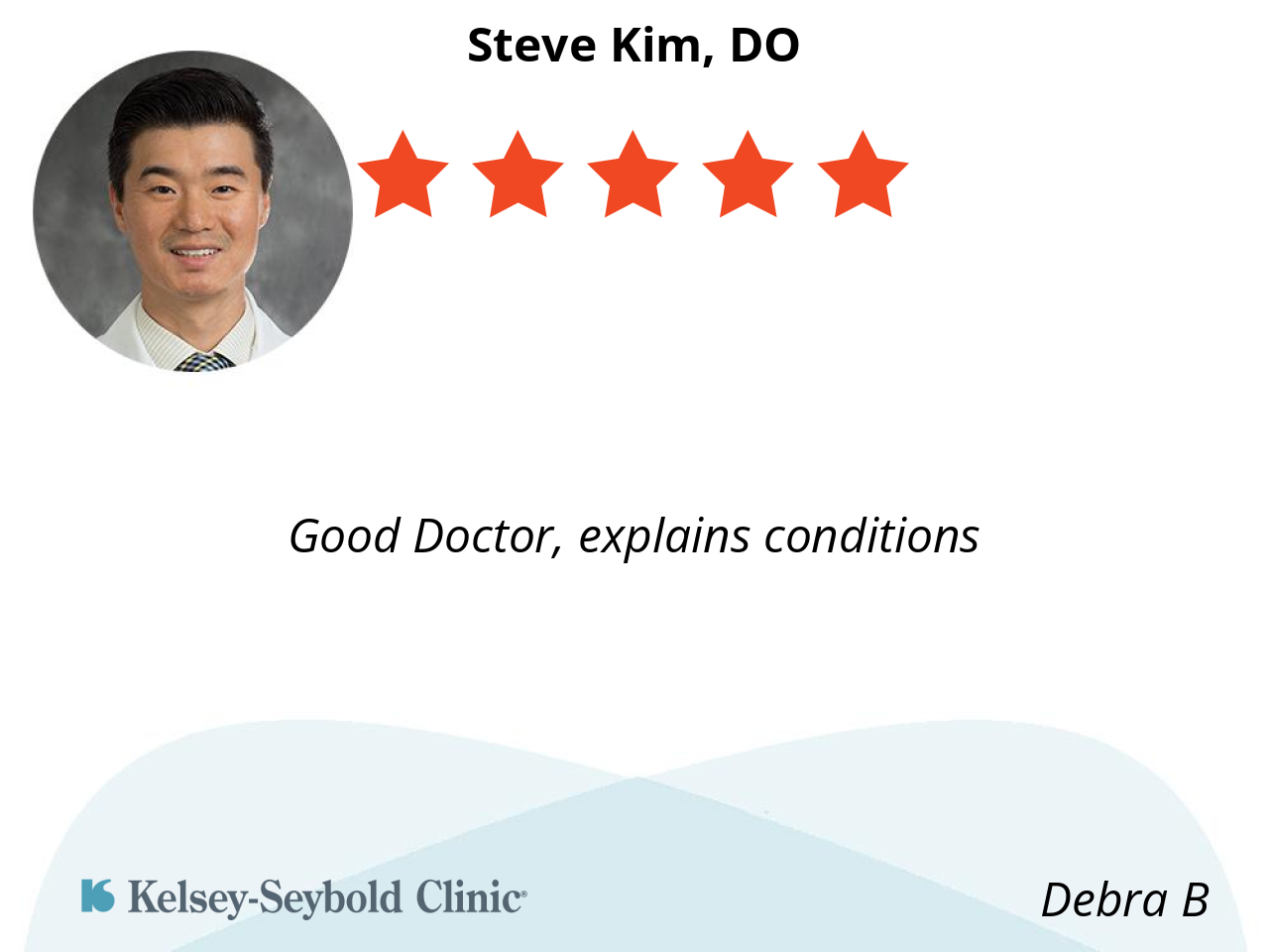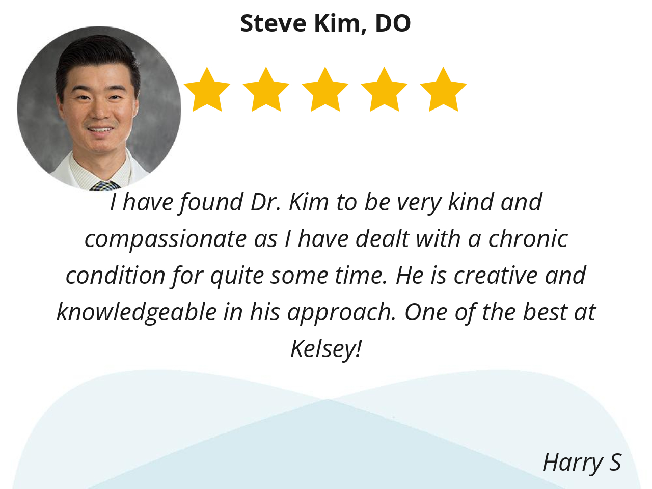 I have found Dr. Kim to be very kind and compassionate as I have dealt with a chronic condition for quite some time. He is creative and knowledgeable in his approach. One of the best at Kelsey!