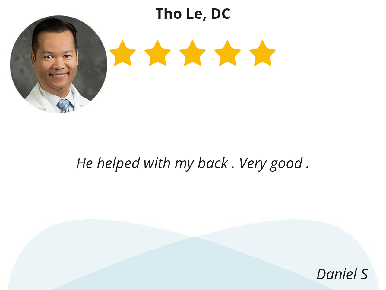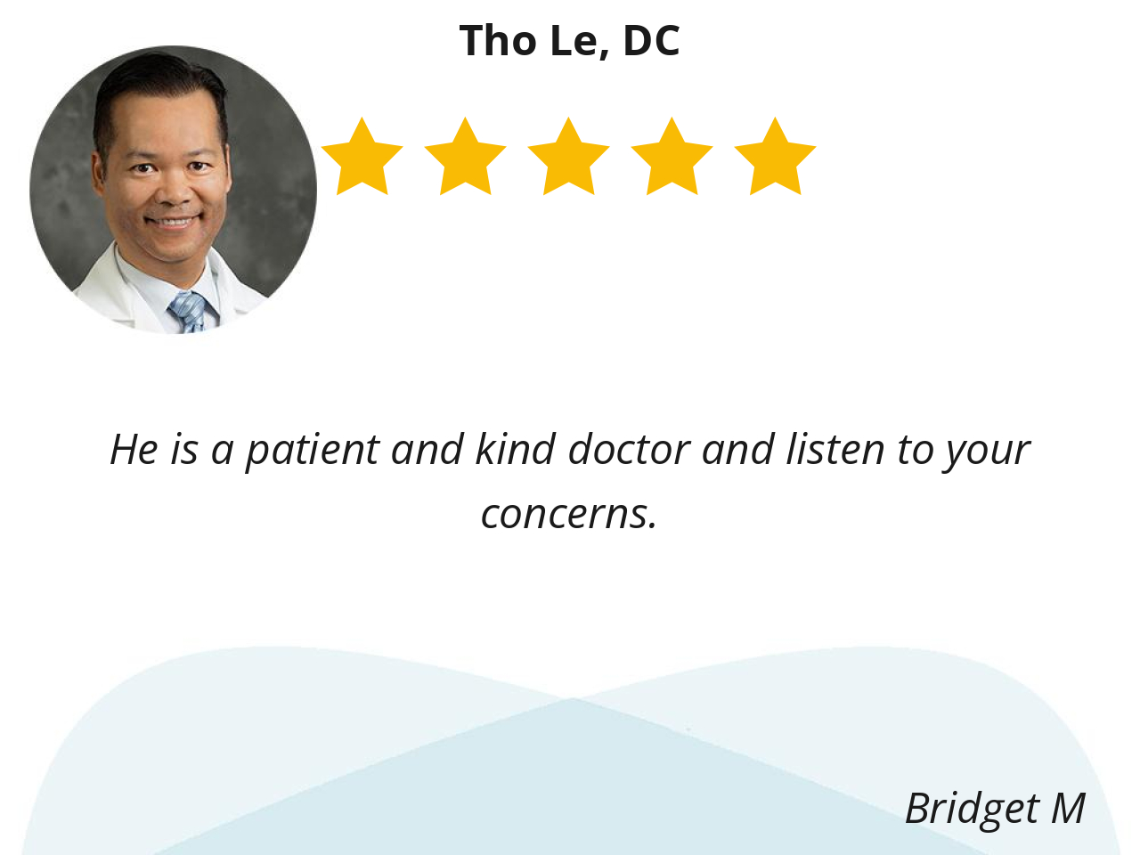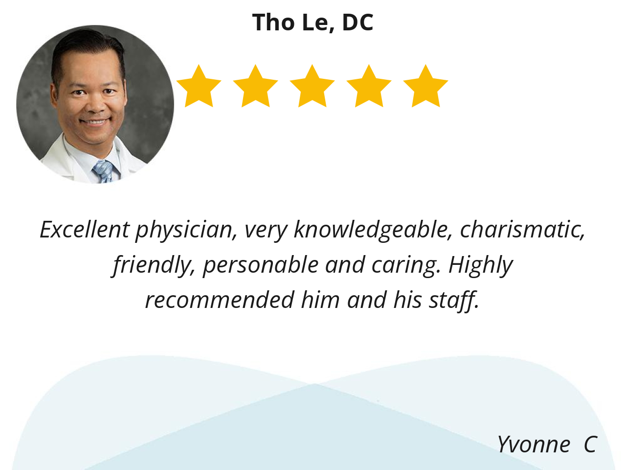 Dr. Le was very welcoming, friendly, knowledgeable, and professional. He listened to my concerns and gave me exercise tips and demonstrations. Overall, he is what I needed. Thank you, Dr. Le.