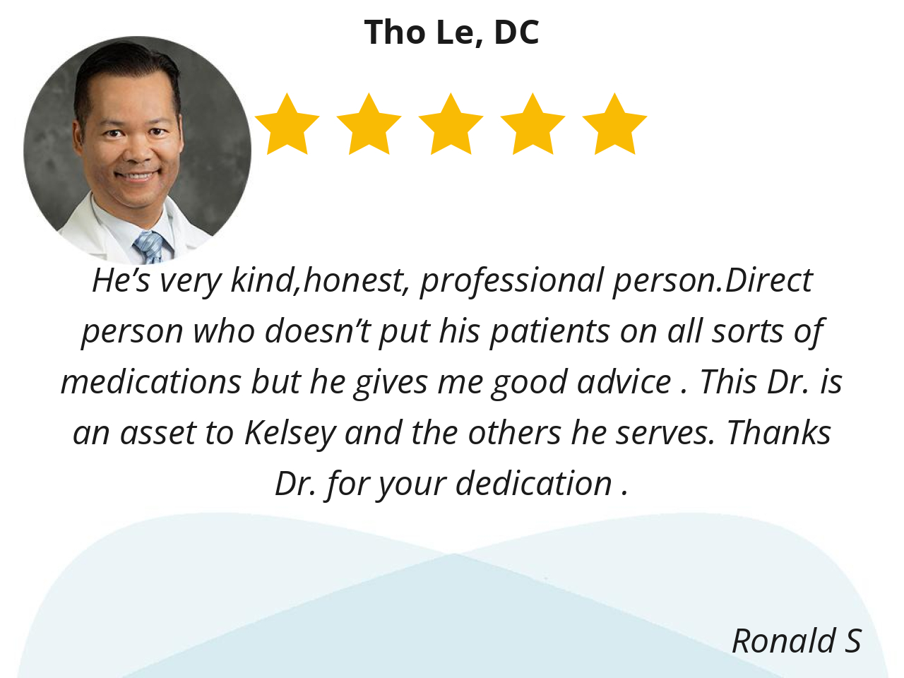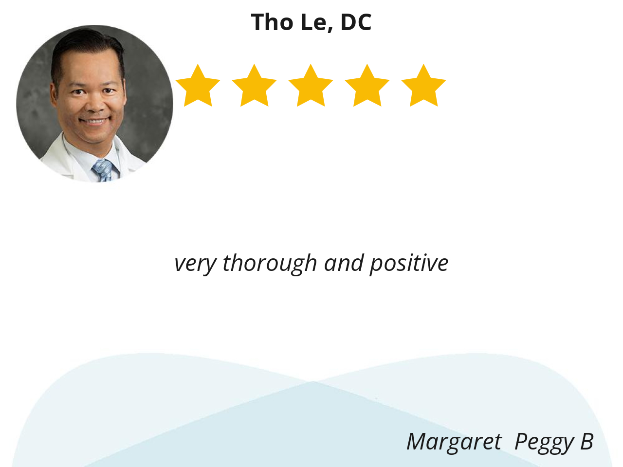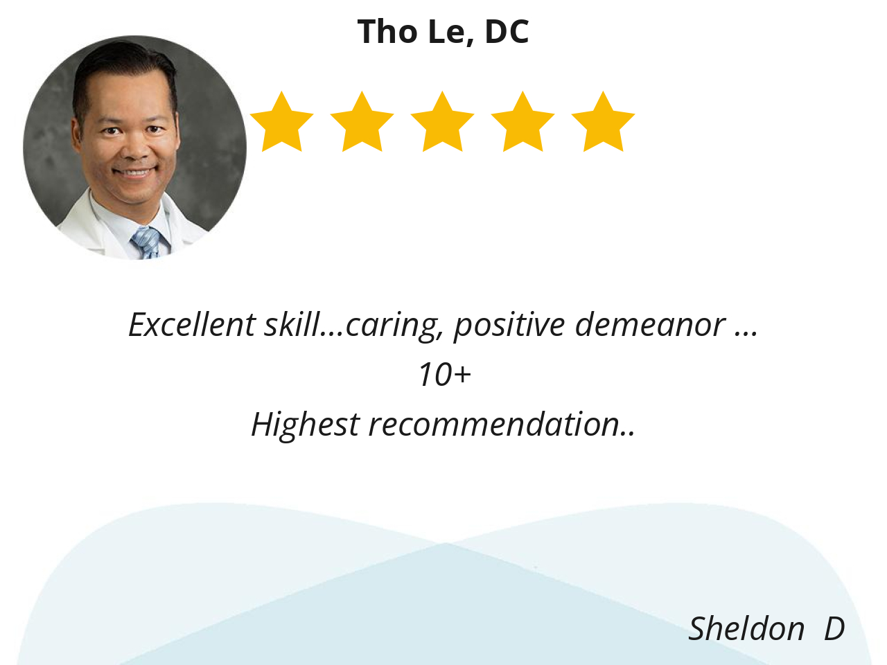Dr. Le was very welcoming, friendly, knowledgeable, and professional. He listened to my concerns and gave me exercise tips and demonstrations. Overall, he is what I needed. Thank you, Dr. Le.