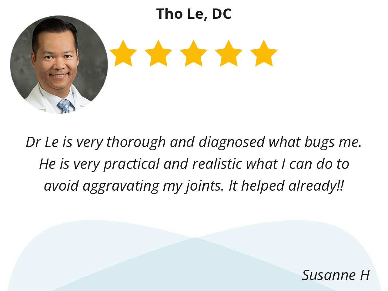 Dr Le is very thorough and diagnosed what bugs me. He is very practical and realistic what I can do to avoid aggravating my joints. It helped already!!
