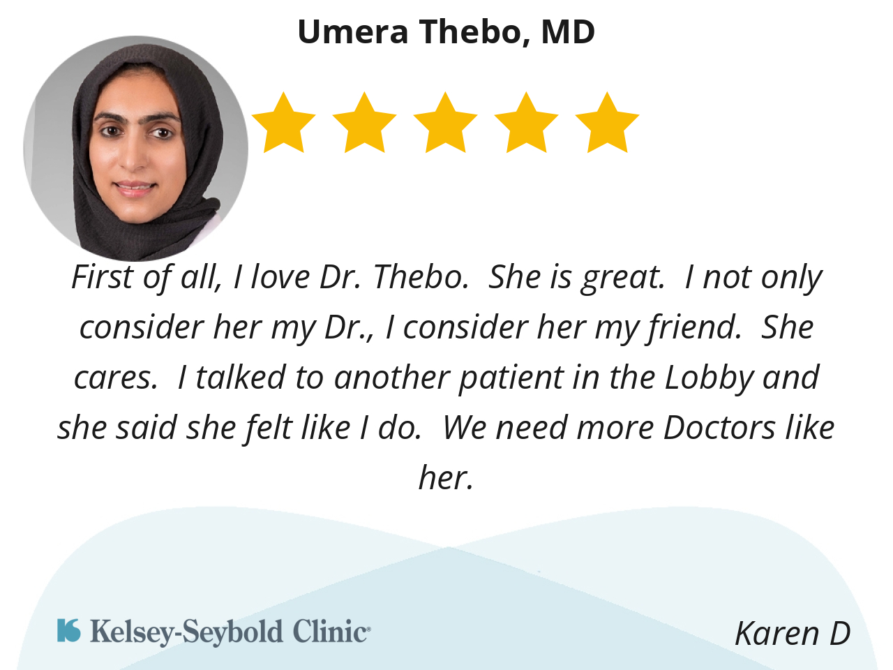First of all, I love Dr. Thebo. She is great. I not only consider her my Dr., I consider her my friend. She cares. I talked to another patient in the Lobby and she said she felt like I do. We need more Doctors like her.