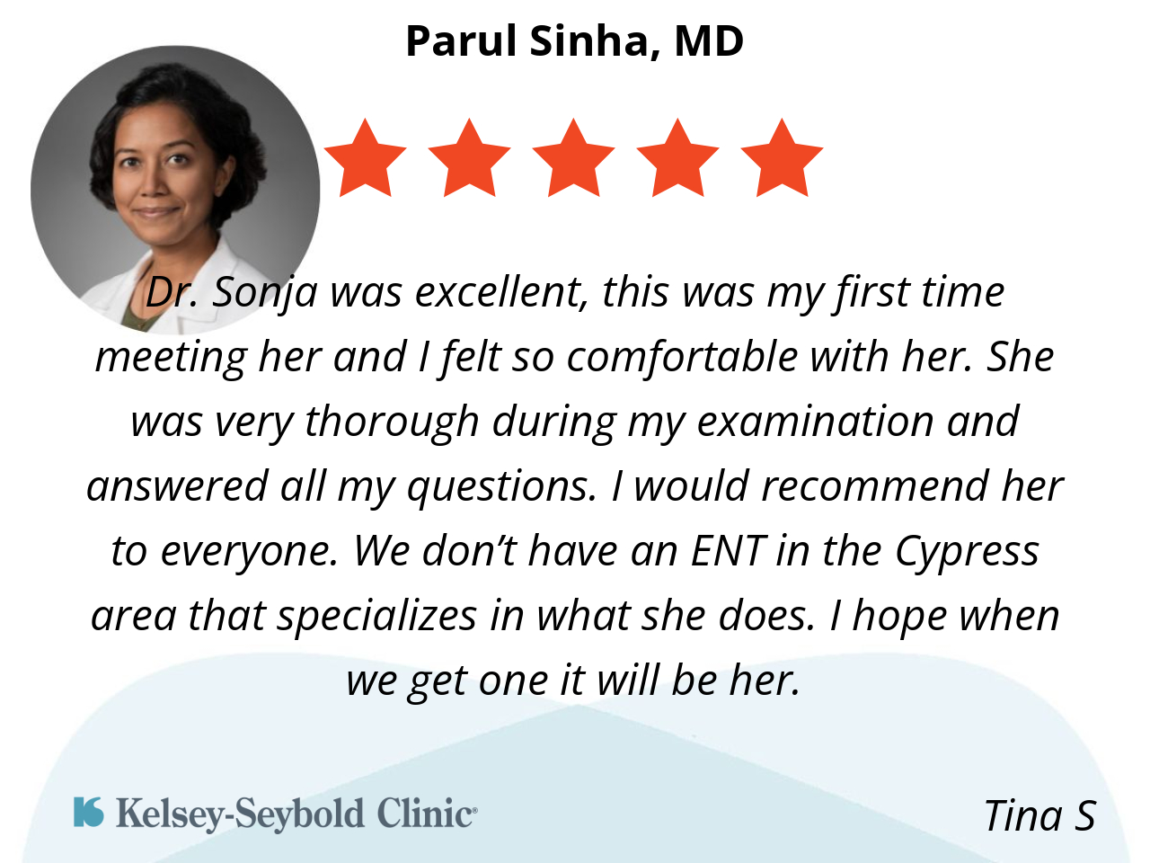 Dr. Sonja was excellent, this was my first time meeting her and I felt so comfortable with her. She was very thorough during my examination and answered all my questions. I would recommend her to everyone. We don’t have an ENT in the Cypress area that specializes in what she does. I hope when we get one it will be her.