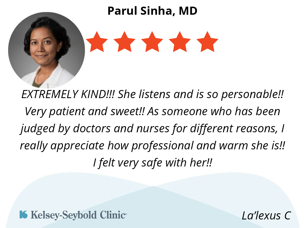 EXTREMELY KIND!!! She listens and is so personable!! Very patient and sweet!! As someone who has been judged by doctors and nurses for different reasons, I really appreciate how professional and warm she is!! I felt very safe with her!!