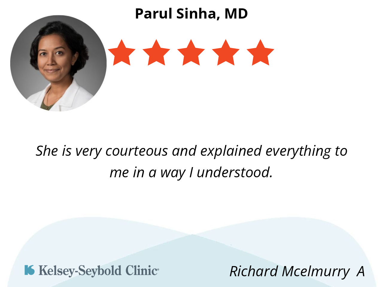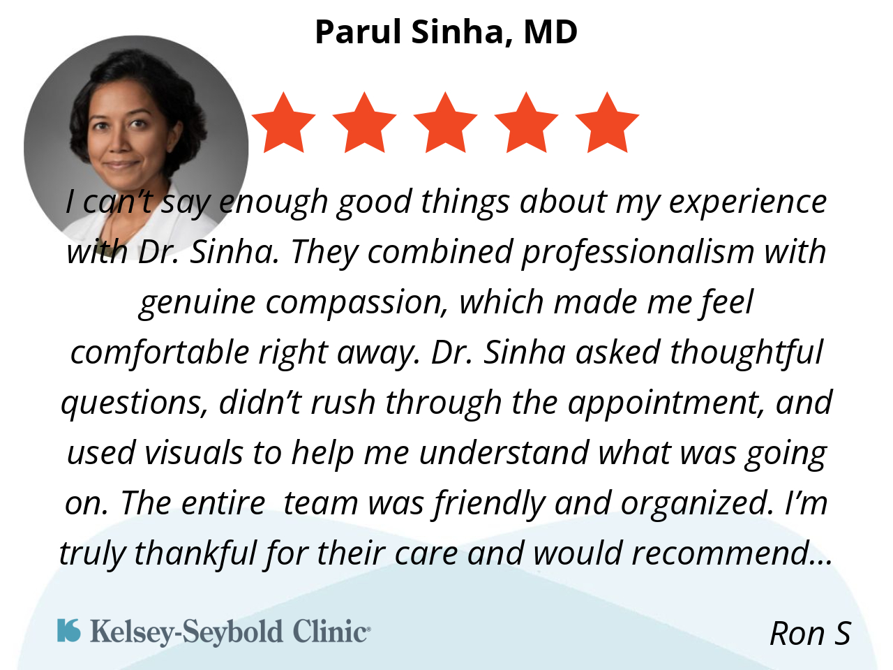 I can’t say enough good things about my experience with Dr. Sinha. They combined professionalism with genuine compassion, which made me feel comfortable right away. Dr. Sinha asked thoughtful questions, didn’t rush through the appointment, and used visuals to help me understand what was going on. The entire team was friendly and organized. I’m truly thankful for their care and would recommend them without hesitation.