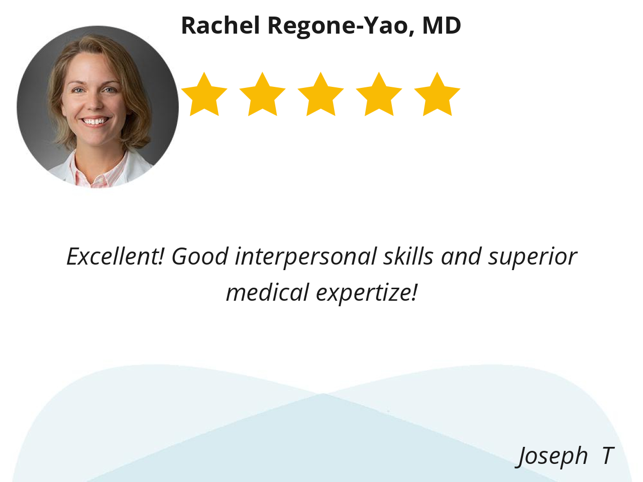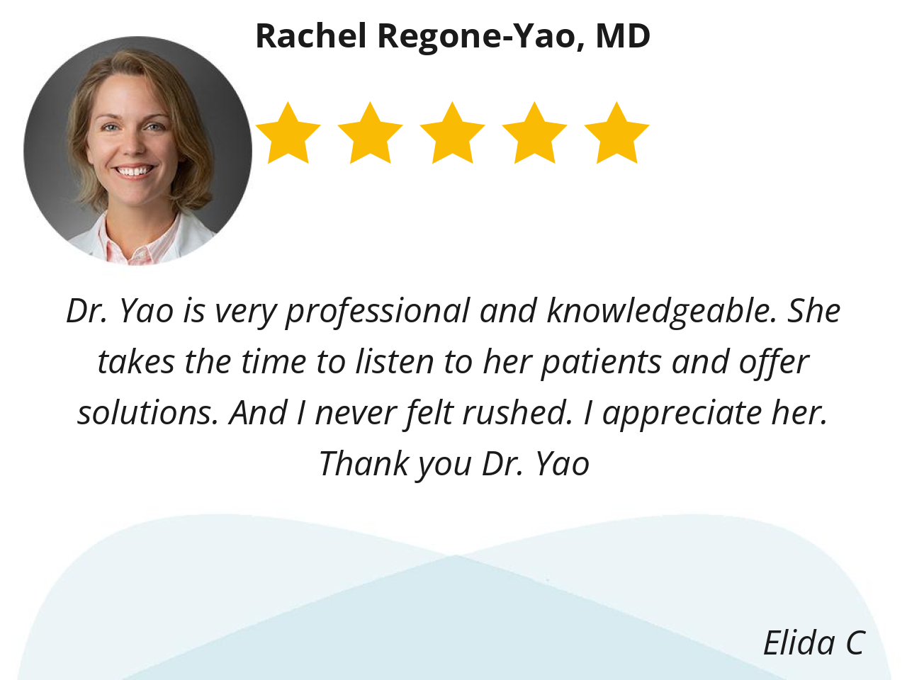 Dr. Yao is very professional and knowledgeable. She takes the time to listen to her patients and offer solutions. And I never felt rushed. I appreciate her. Thank you Dr. Yao