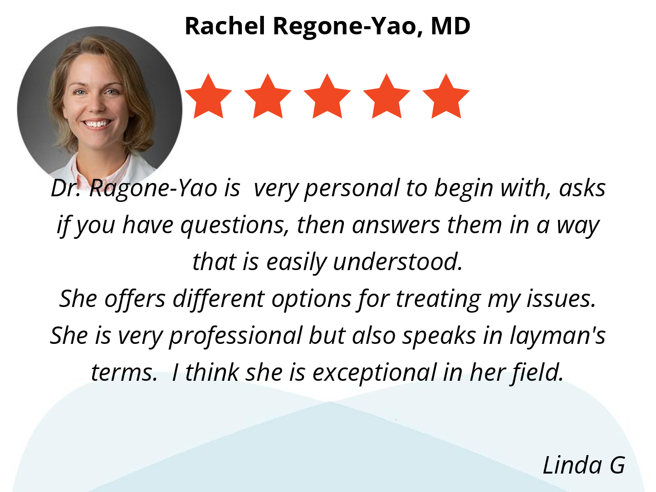Dr. Ragone-Yao is very personal to begin with, asks if you have questions, then answers them in a way that is easily understood.