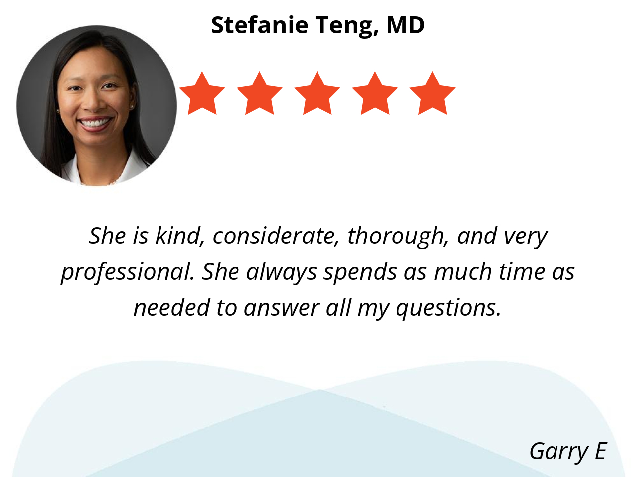 I feel Dr. Teng is a caring and dedicated physician. She listens to my concerns/questions and adddress them in a manner that is easy to understand.