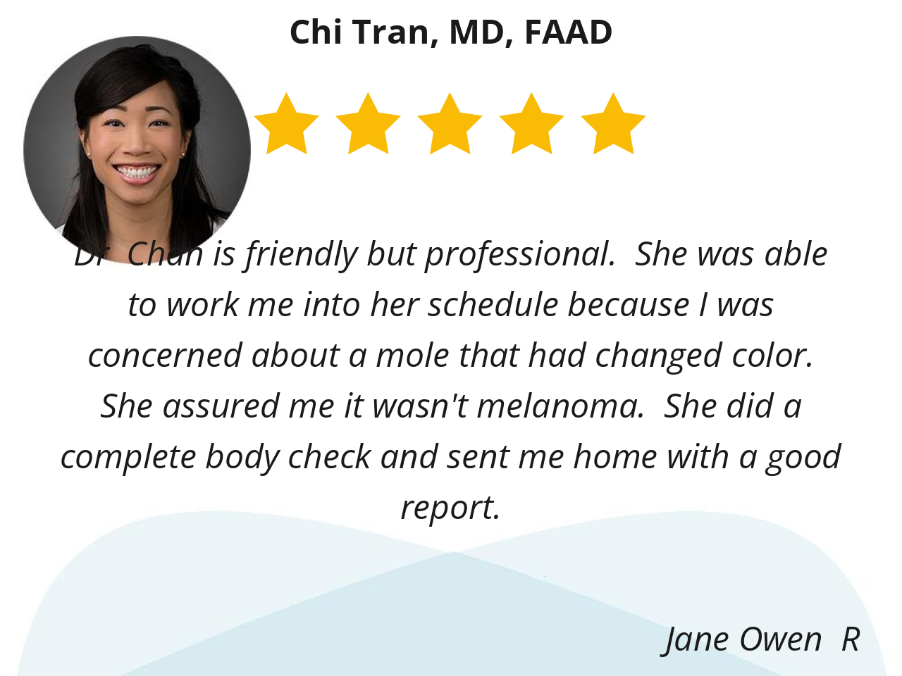 Dr Chan is friendly but professional. She was able to work me into her schedule because I was concerned about a mole that had changed color. She assured me it wasn't melanoma. She did a complete body check and sent me home with a good report.