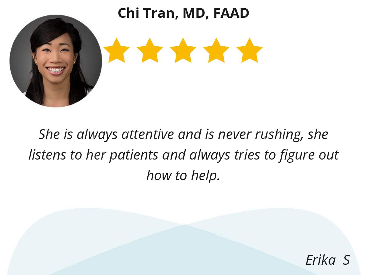 Dr. Tran is real nice and caring Doctor doing her job she will explain what she would be doing. Always telling you what she’s doing next and how long it will take I really like that. I really like Dr. Tran keep up your amazing and wonderful job Doctor . You are just to friendly and awesome. Keep up your outstanding work and your staff too.