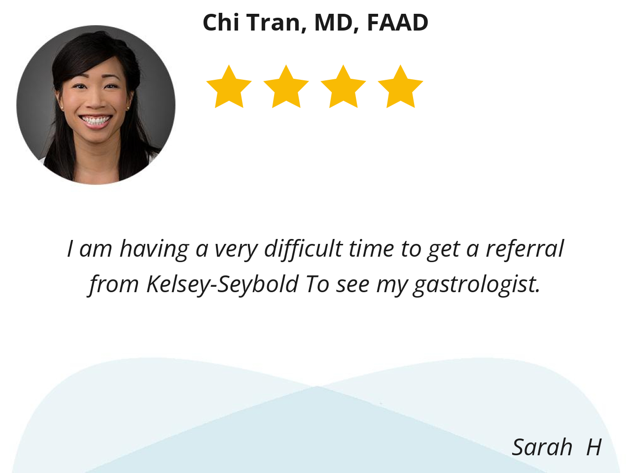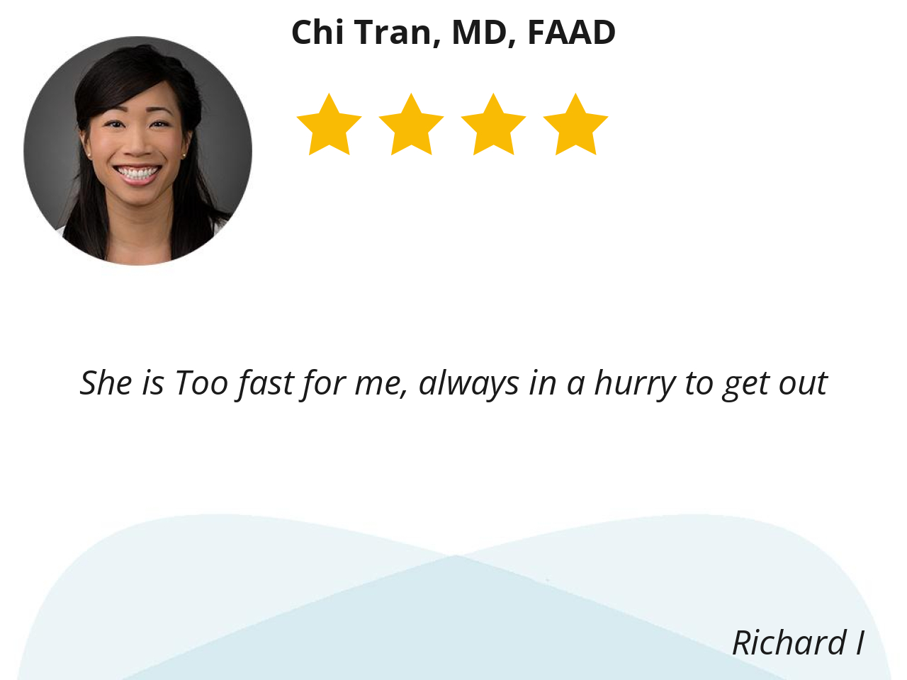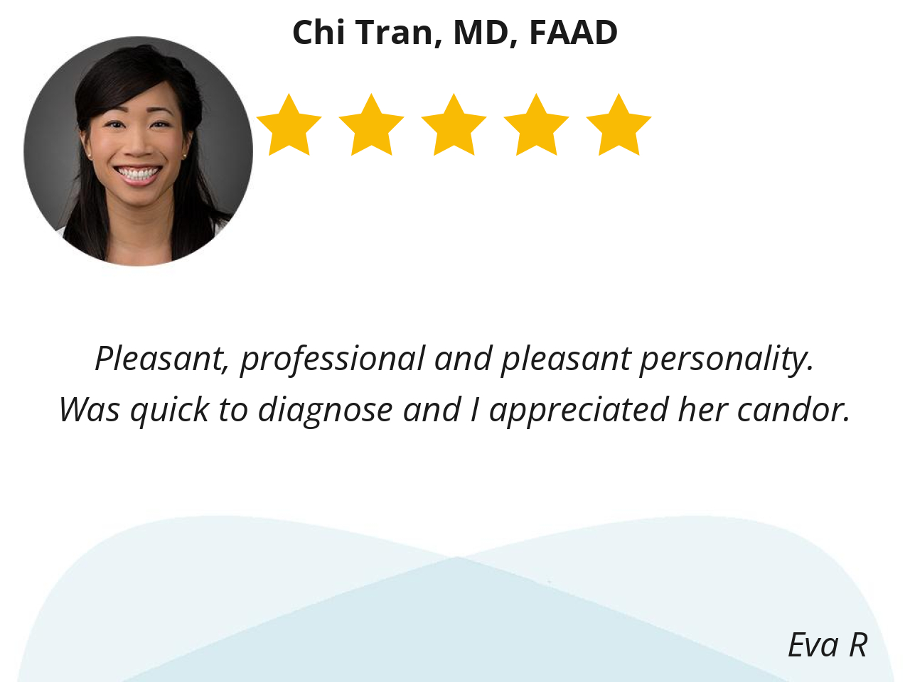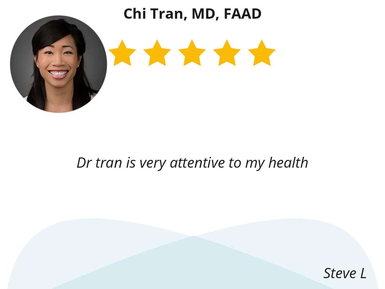 Dr. Tran is very efficient yet takes time to listen to what I have to say and answer my questions. She is also very professional. I highly recommend her.