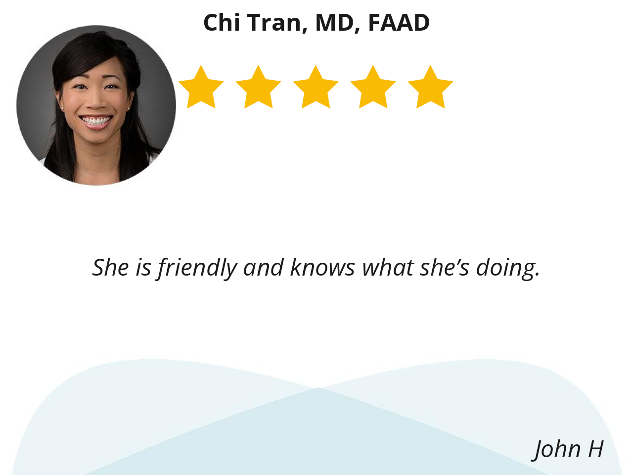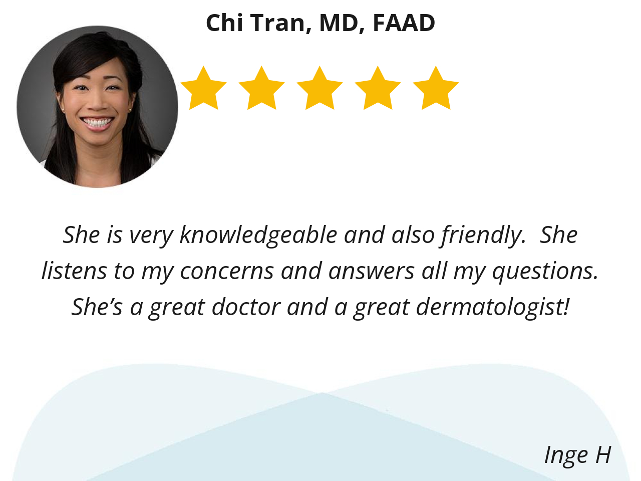 She is very knowledgeable and also friendly. She listens to my concerns and answers all my questions. She’s a great doctor and a great dermatologist!
