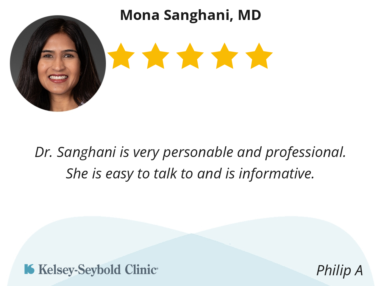 Dr. Sanghani is very personable and professional. She is easy to talk to and is informative.
