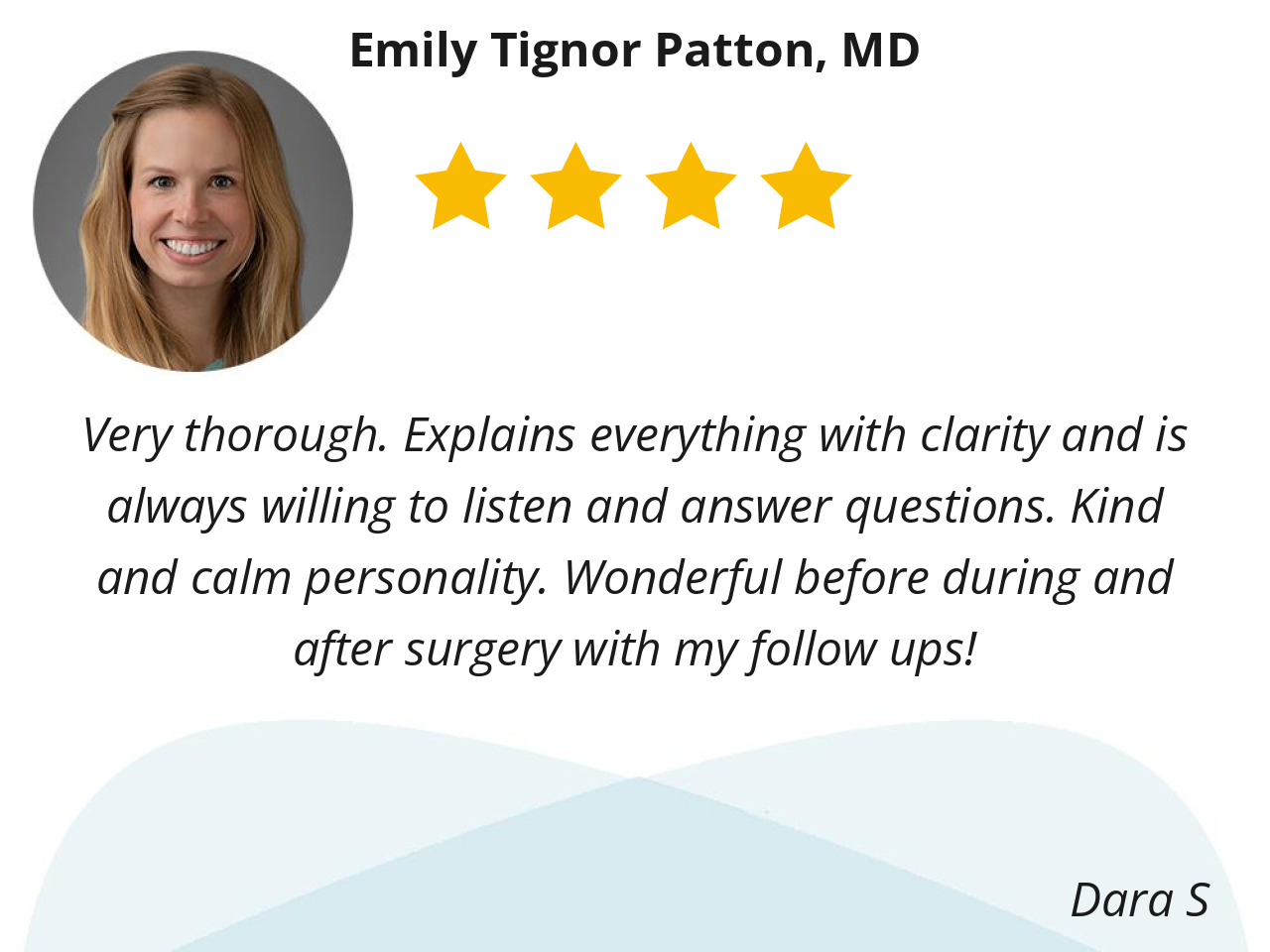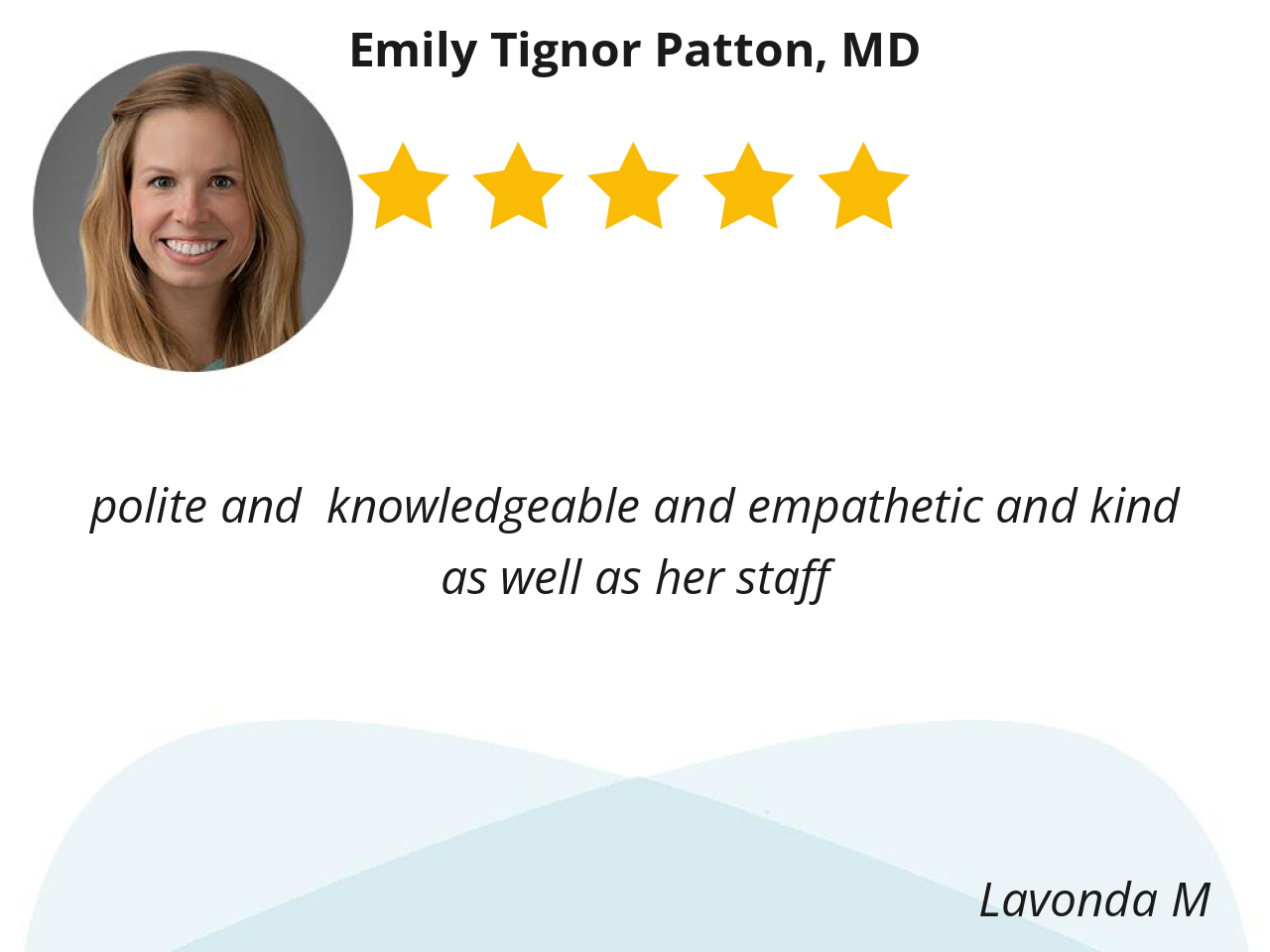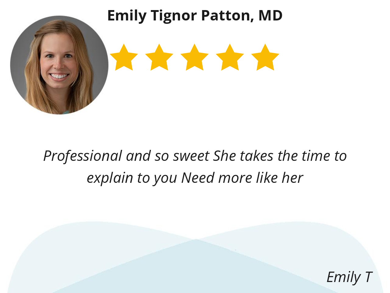 Dr. Emily Patton is an excellent physician . This was my first time meeting her and she quickly determined my diagnosis . She vacuumed out my left ear and no one had ever done this before . She checked my throat and my nose . She did just what her job title implies . No other Dr had ever done this . She told me what to put in my nostril because i suffer from very dry nose and it makes a scab and it’s painful . I did what she told me to do and the following day i was so much better . I wish someone had told me this a long time ago and i didn’t have to suffer from this dry nose . On my left ear after she vacuumed she told me i have an ulcer in my ear . I was shocked to hear this . She also told me i had an exposed bone . I had seen so many drs and no one evaluated this information to me before they just do the elephant flush out on my ear . Dr Patton told me to use these ear drops for two wks and come back and visit her and see how it looks because she said she might have to get a biopsy . She said this could turn into cancer . I was shocked with all this information i received. I hope all turns out well and i wasn’t too late in finding this wonderful Dr . I asked how could this happen but there’s no way of really knowing and she said maybe from infection . The other Drs well the assistants they try to flush my ear and said they couldn’t get it all ( the wax buildup was stuck way in the back ) and they said they didn’t want to irritate it any more . I wonder if maybe they could’ve done more harm . I really needed to be checked by ENT the professionals in this field . I’m so thankful for this Dr and i really appreciate all she’s done for me and i will continue to see her and I’ll recommend her to anyone i know .