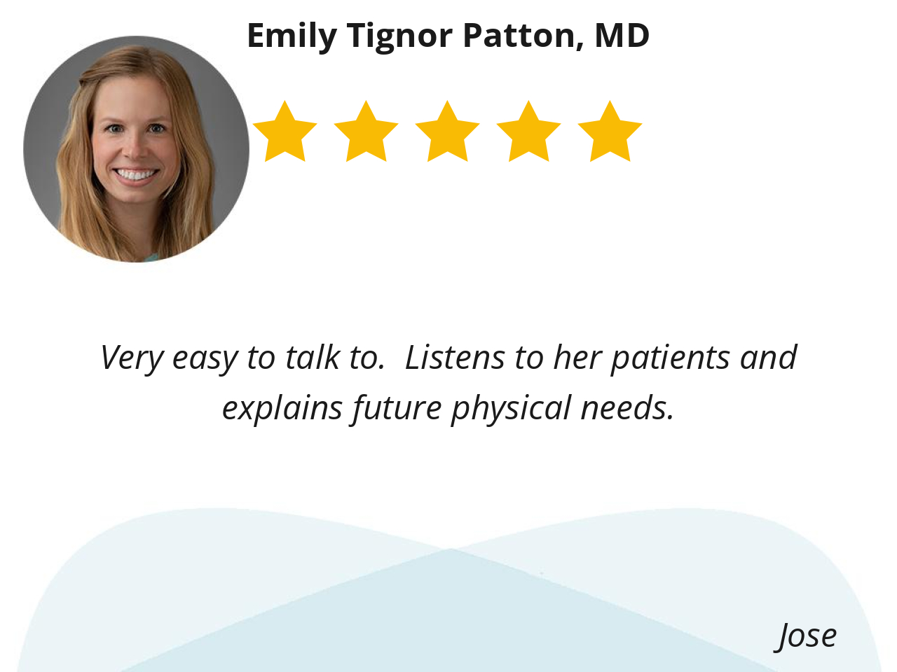 Very easy to talk to. Listens to her patients and explains future physical needs.
