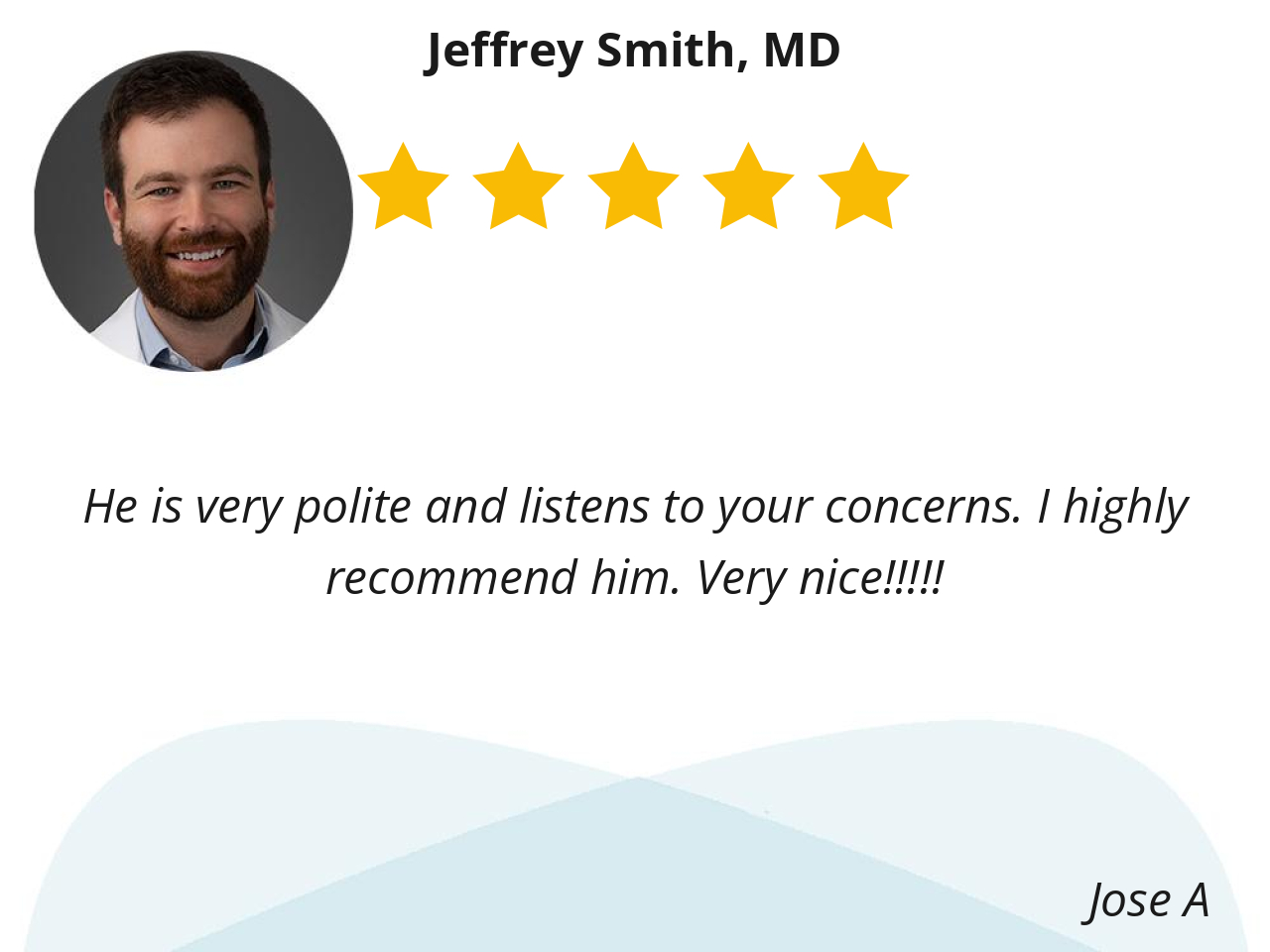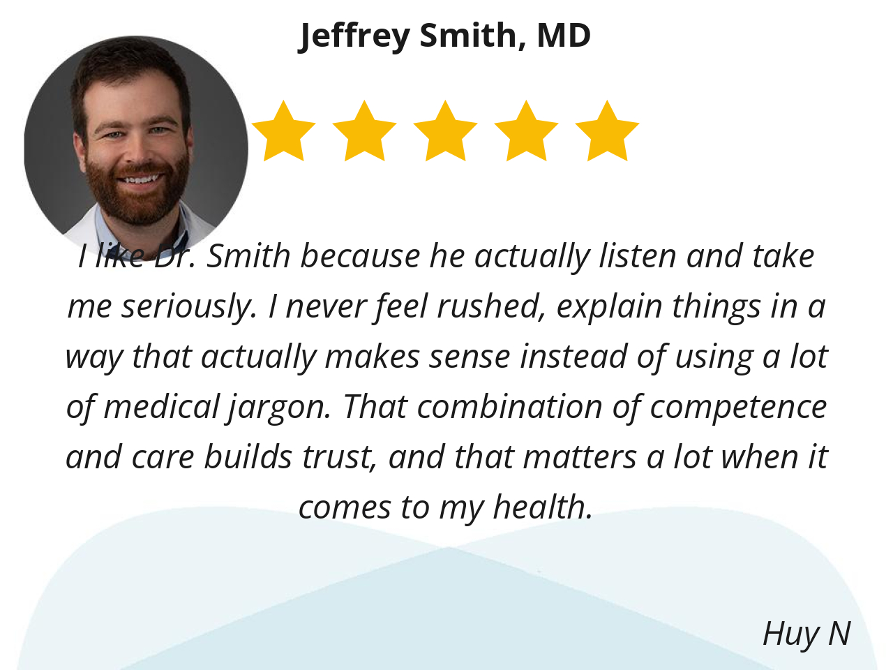 I like Dr. Smith because he actually listen and take me seriously. I never feel rushed, explain things in a way that actually makes sense instead of using a lot of medical jargon. That combination of competence and care builds trust, and that matters a lot when it comes to my health.