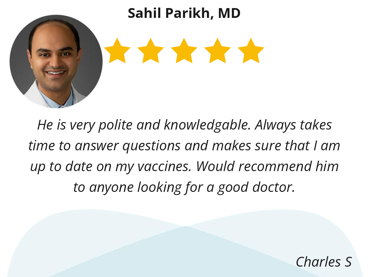 Dr. Parikh has been my primary care physician for about 5 years. He is genuinely concerned for my continued well being.