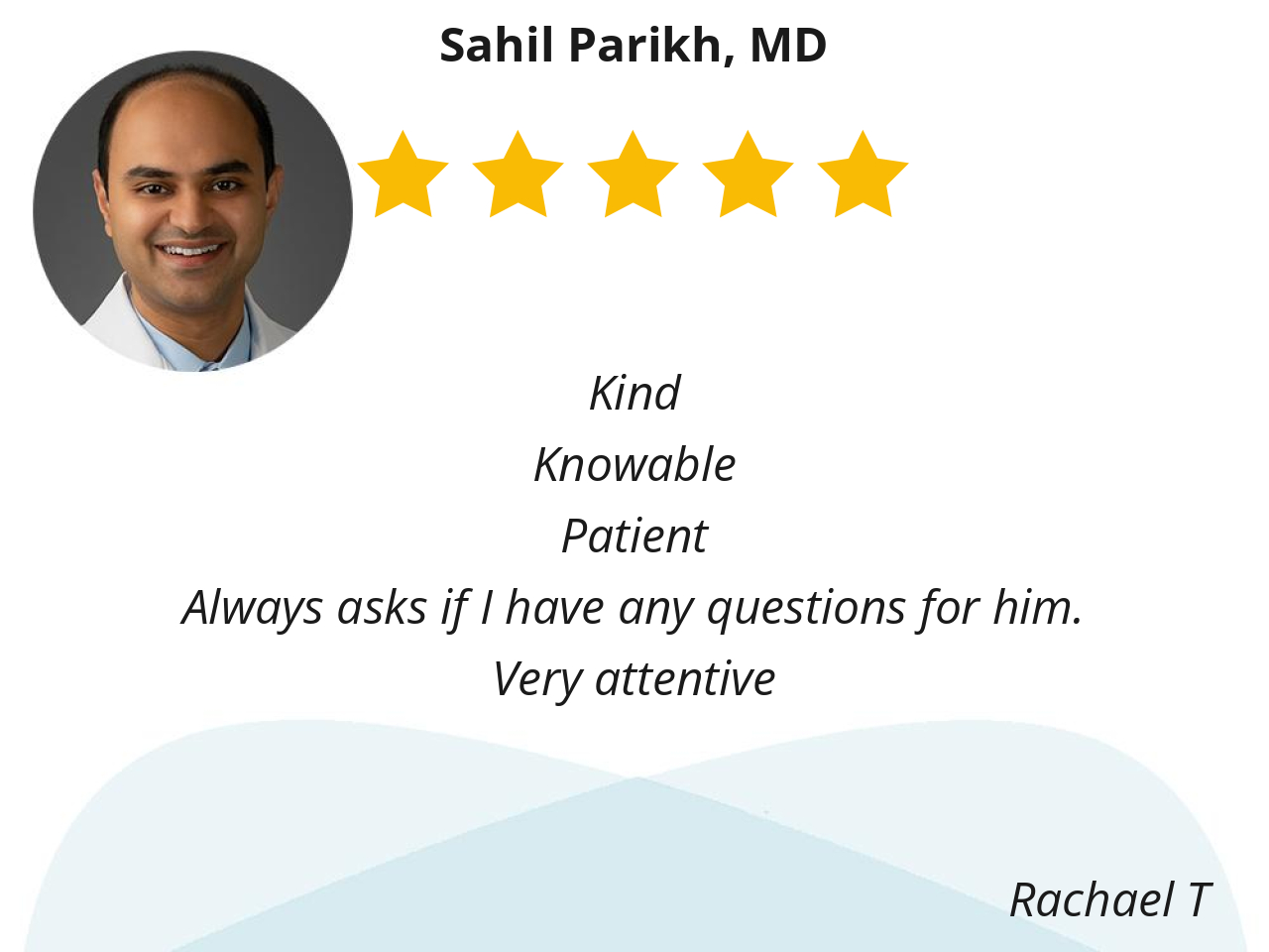 Dr Parikh always provides outstanding medical care and advice. I feel he truly cares and I always feel my issues are properly handled.