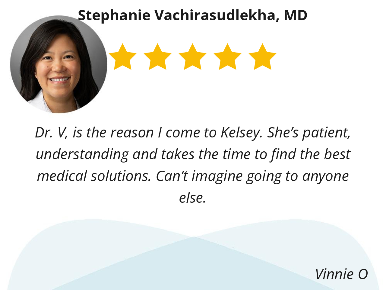 Dr. V, is the reason I come to Kelsey. She’s patient, understanding and takes the time to find the best medical solutions. Can’t imagine going to anyone else.