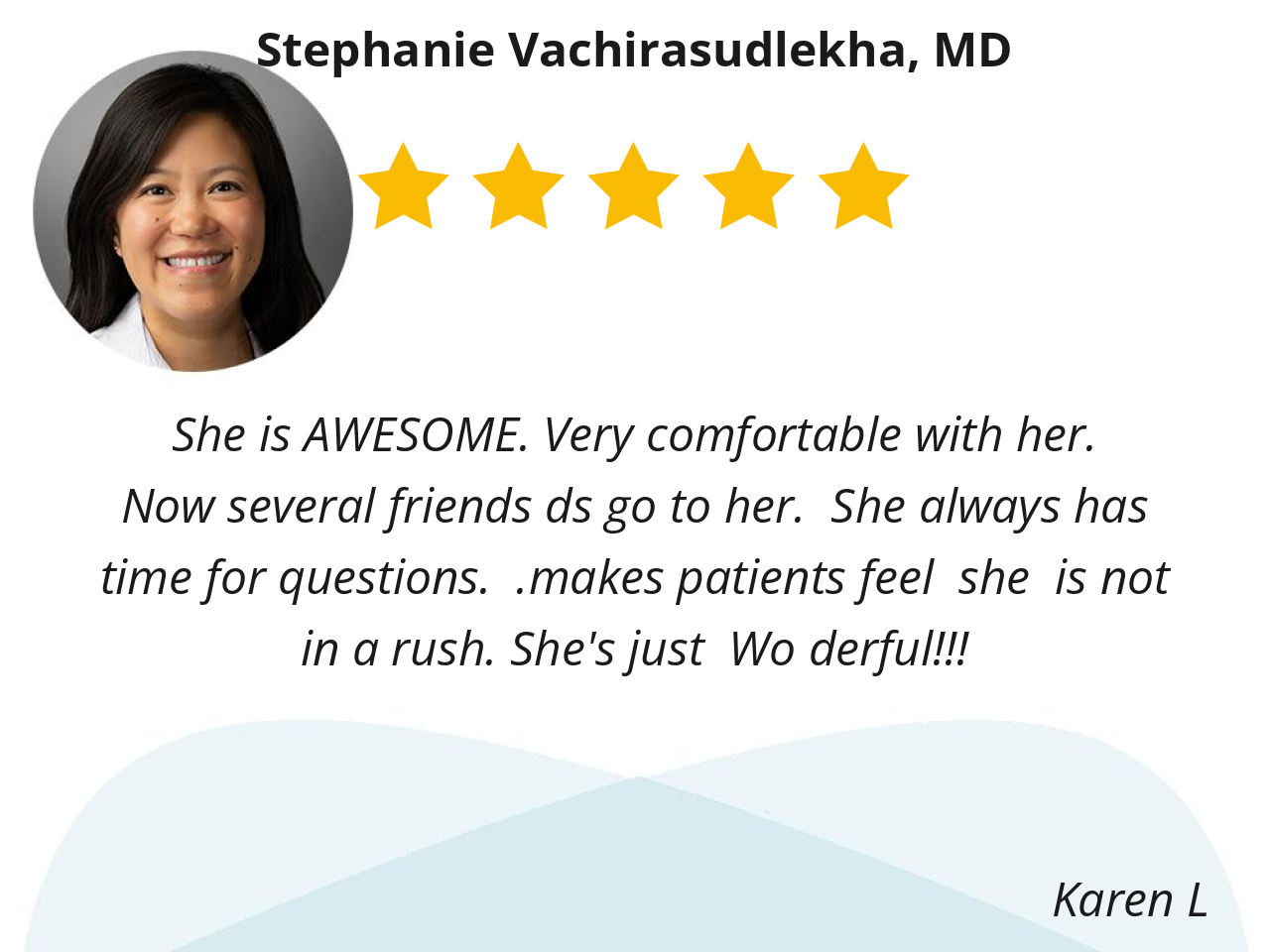 Dr. Stephanie Vachirasudlecka (or Dr. V) is an amazing Primary Care Physician. She is so kind, caring, knowledgeable and takes her time to explain everything to you in detail. She is never rushed and truly cares about her patients. I could not say enough kind things about her. Her staff is very kind and caring as well.