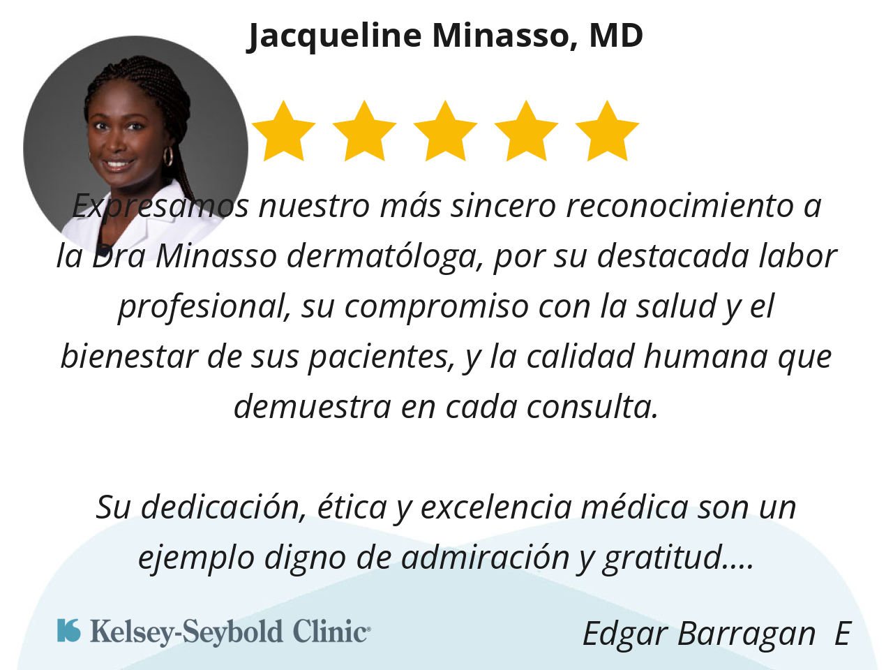 Expresamos nuestro más sincero reconocimiento a la Dra Minasso dermatóloga, por su destacada labor profesional, su compromiso con la salud y el bienestar de sus pacientes, y la calidad humana que demuestra en cada consulta.