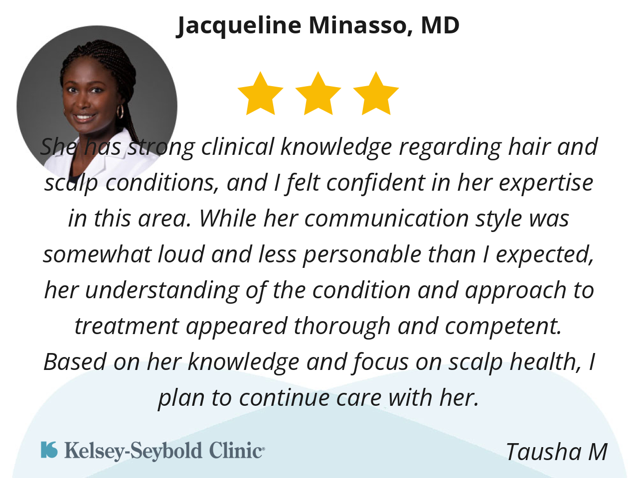 She has strong clinical knowledge regarding hair and scalp conditions, and I felt confident in her expertise in this area. While her communication style was somewhat loud and less personable than I expected, her understanding of the condition and approach to treatment appeared thorough and competent. Based on her knowledge and focus on scalp health, I plan to continue care with her.