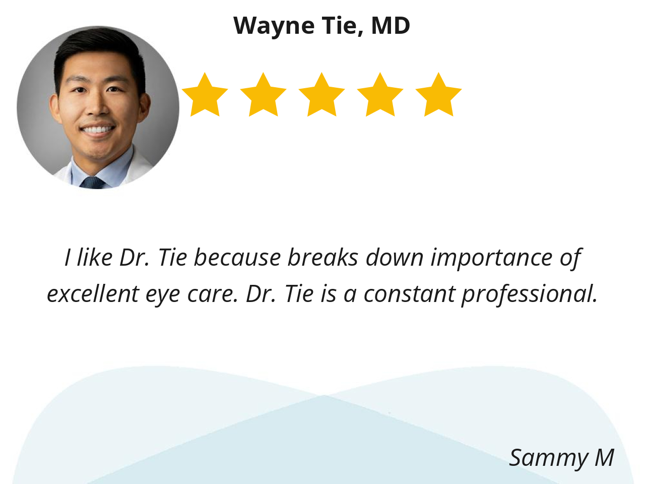I like Dr. Tie because breaks down importance of excellent eye care. Dr. Tie is a constant professional.