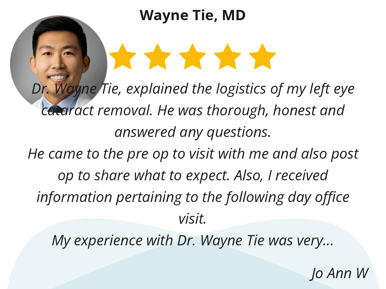 Dr. Wayne Tie, explained the logistics of my left eye cataract removal. He was thorough, honest and answered any questions.