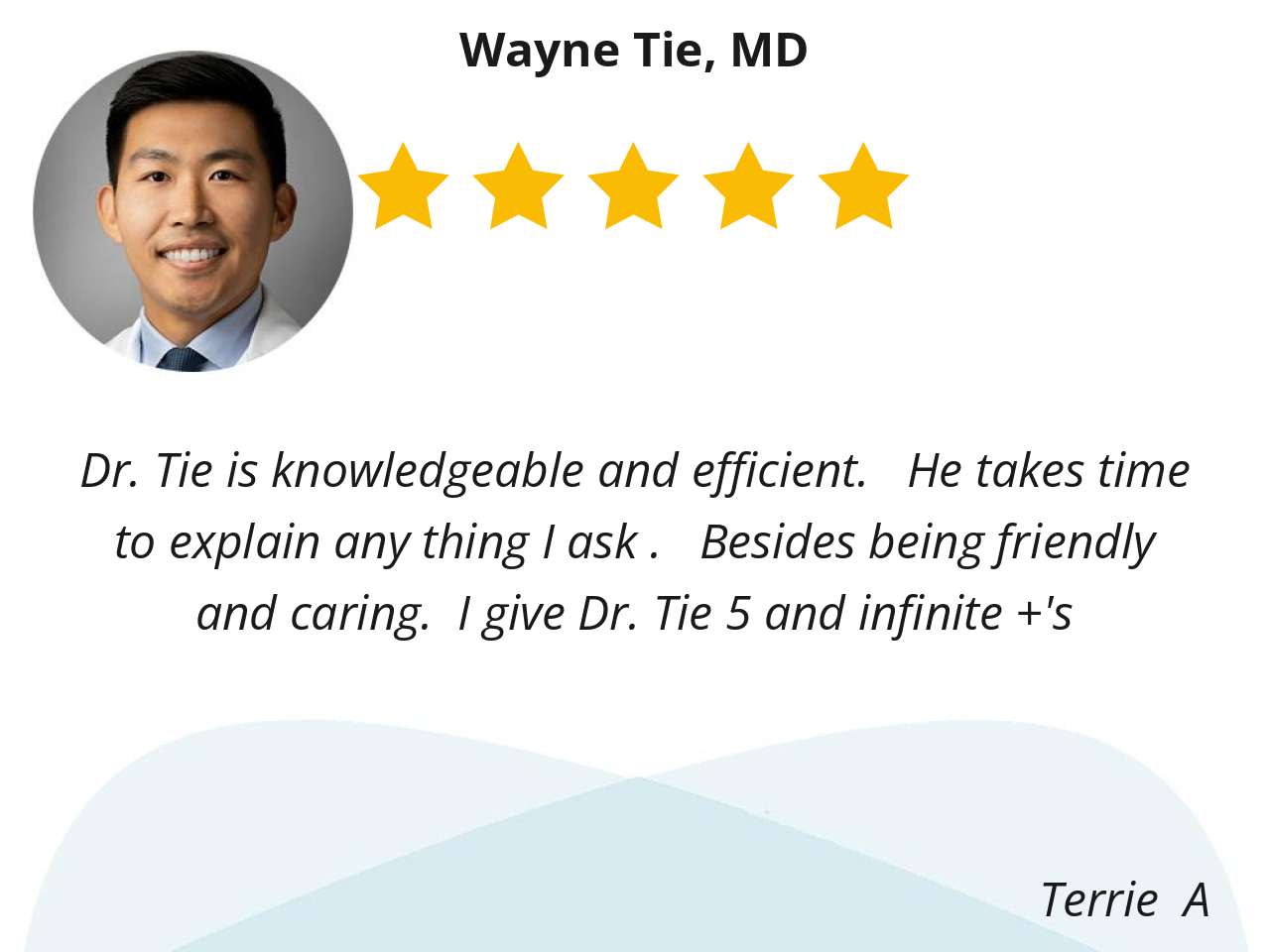 Dr. Tie is knowledgeable and efficient. He takes time to explain any thing I ask . Besides being friendly and caring. I give Dr. Tie 5 and infinite +'s