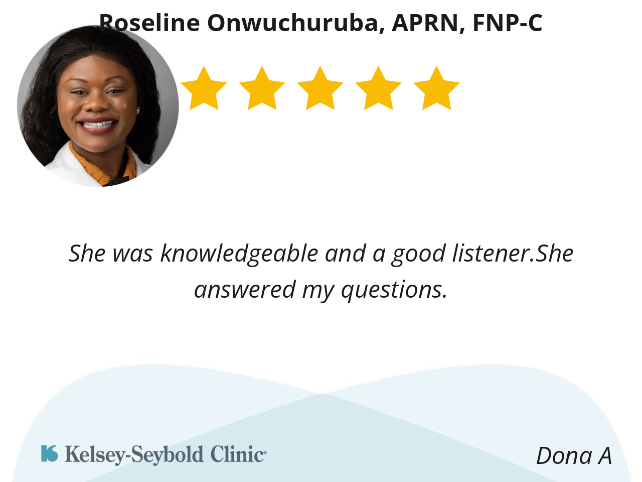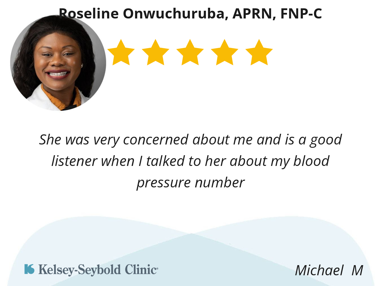 Roseline Onwuchuruba, listens well and shows genuine concern and compassion for me as a patient, and I appreciate that. Additionally it matters to me to be represented in healthcare. I’m always concerned that especially if it’s a white male.