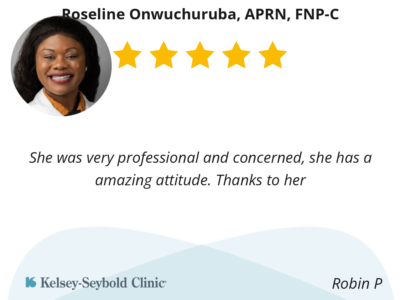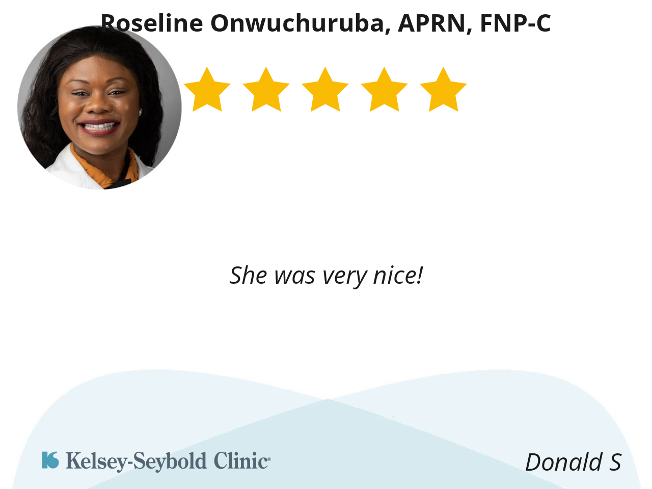 Roseline is a great medical provider… She loves her patients and we love her! Thank you always for your excellent care!