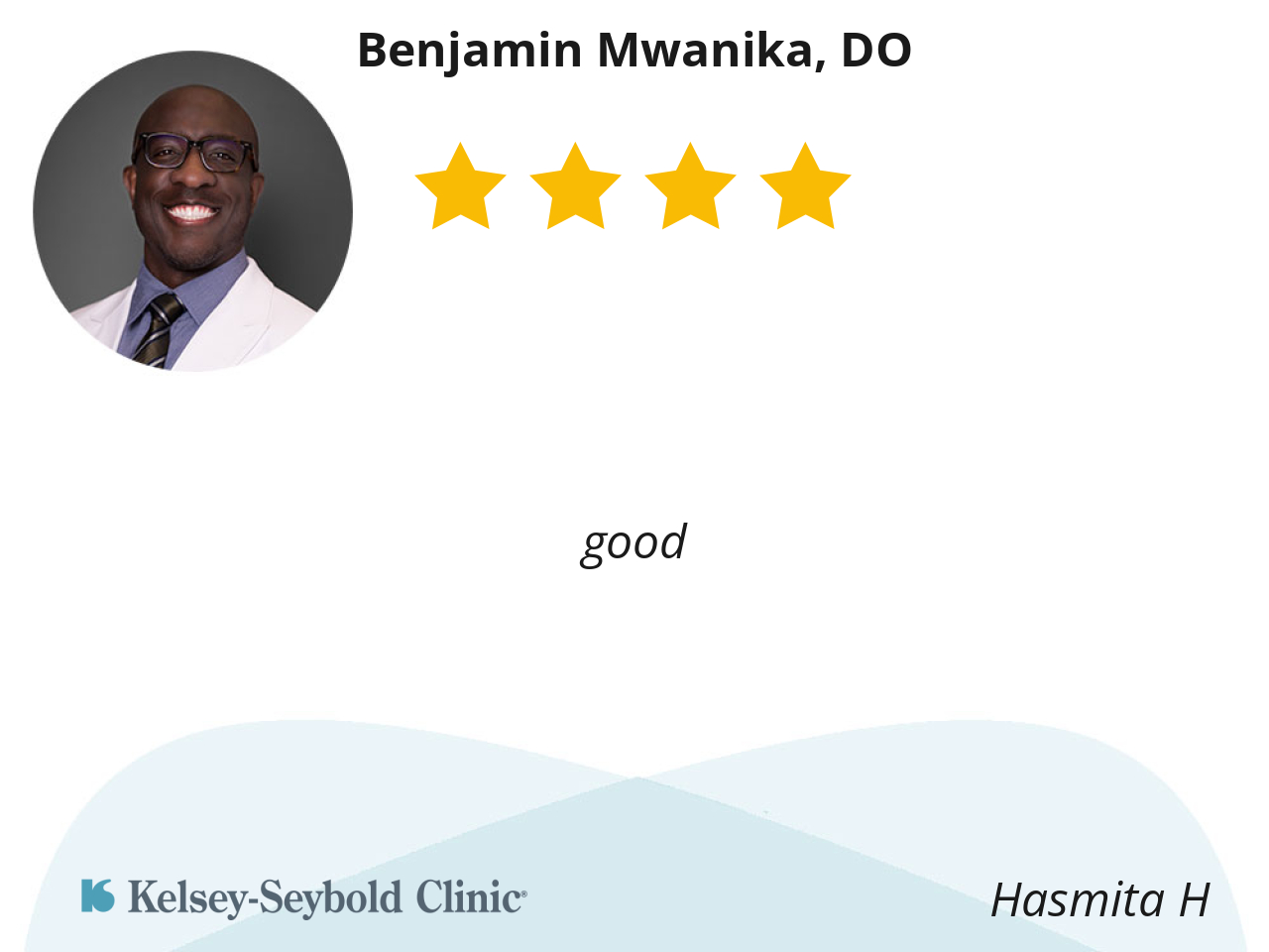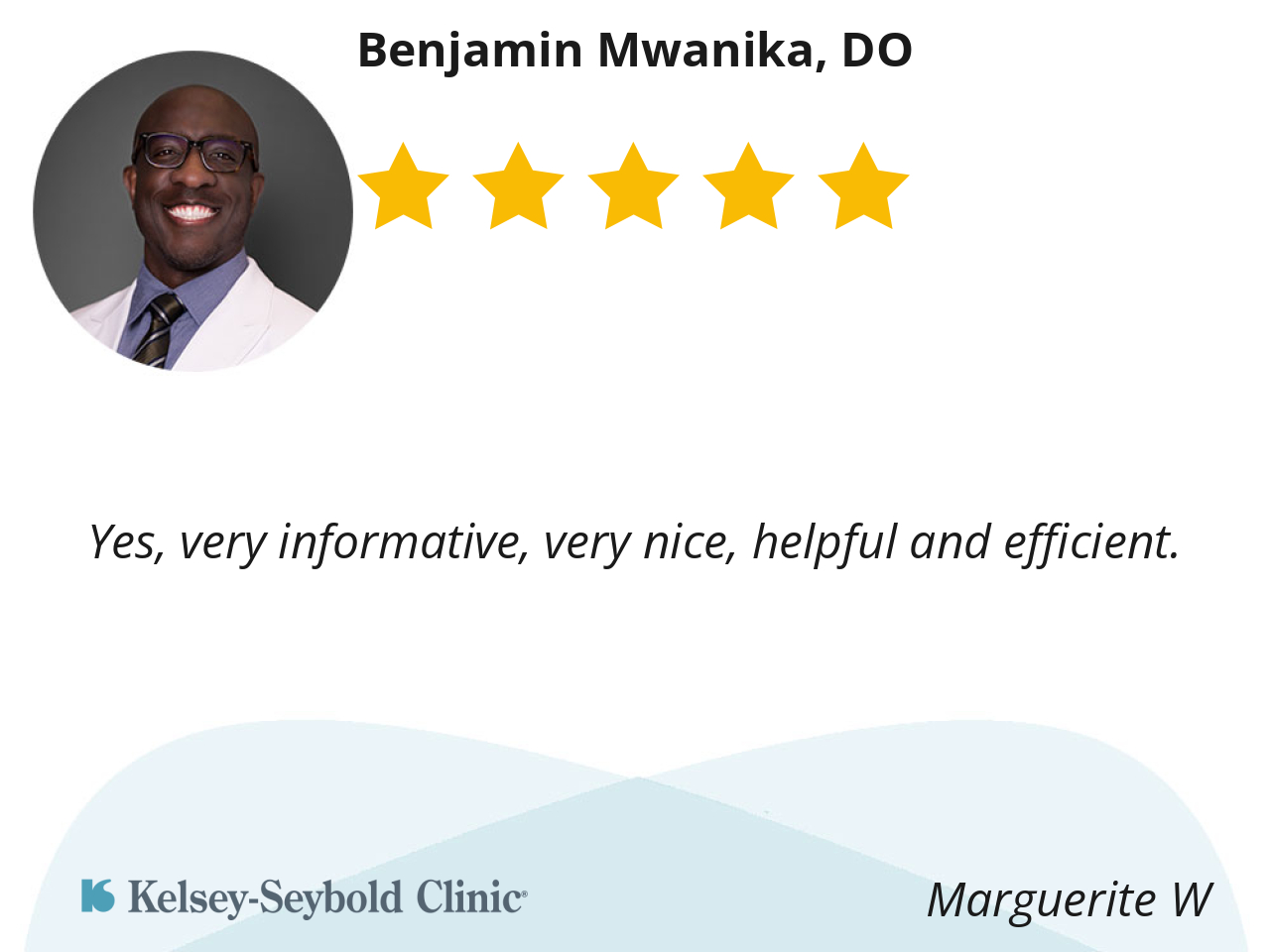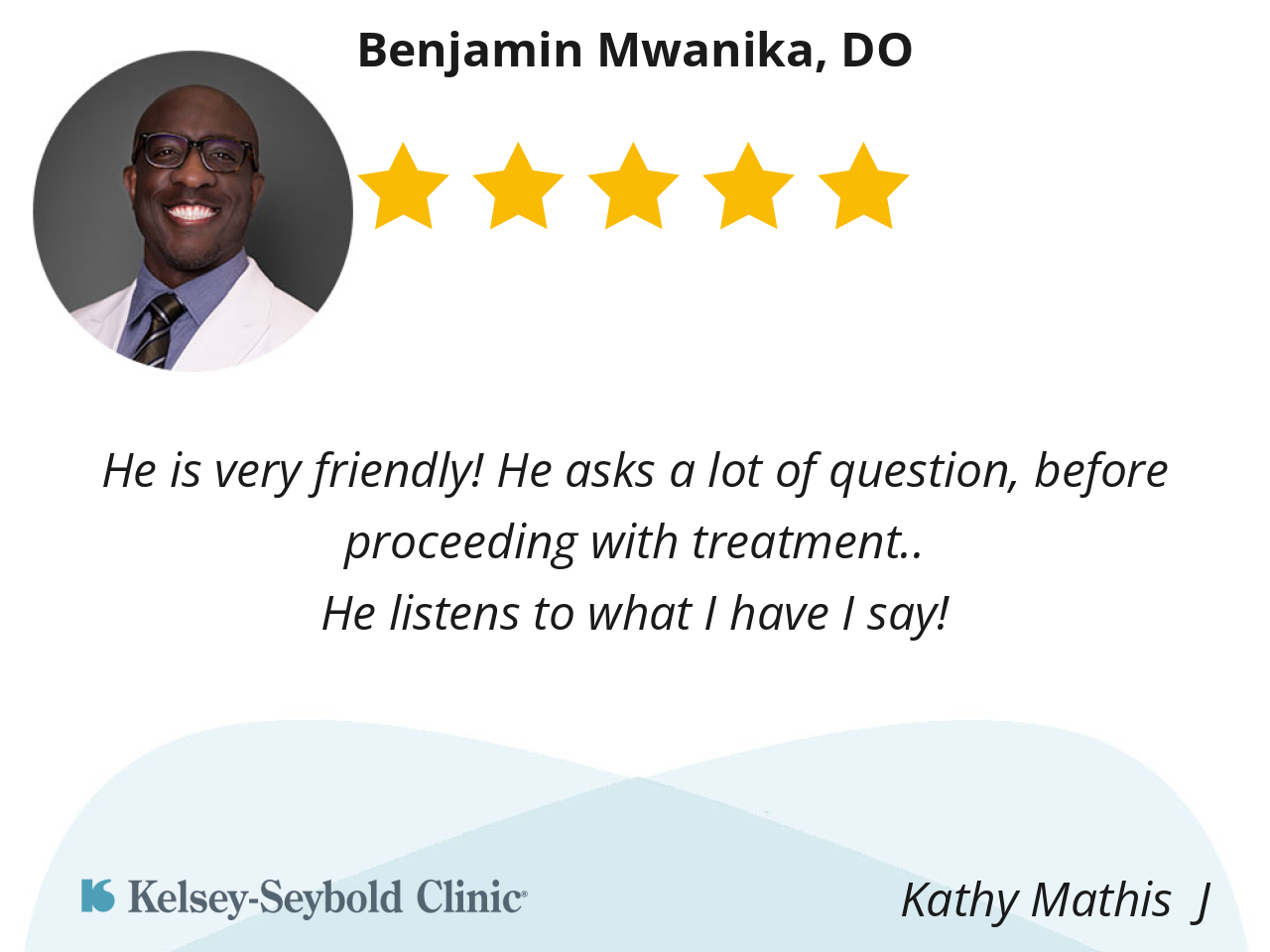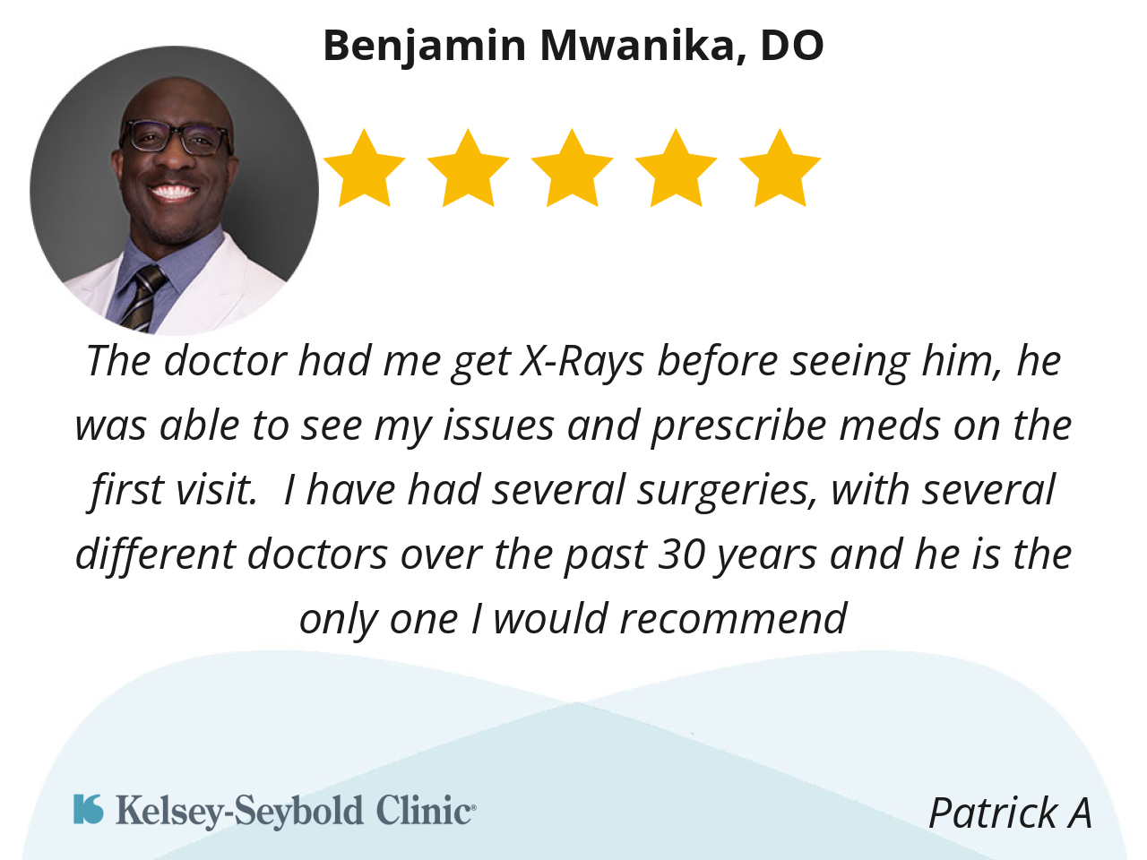 Dr. Mwanika is a very good orthopedic doctor. He’s knowledgeable, a very good listener, and gets straight to the point. Dr. Mwanika will develop a quick treatment plan and give the pros and cons of each without trying to give you more treatment than you really need.
