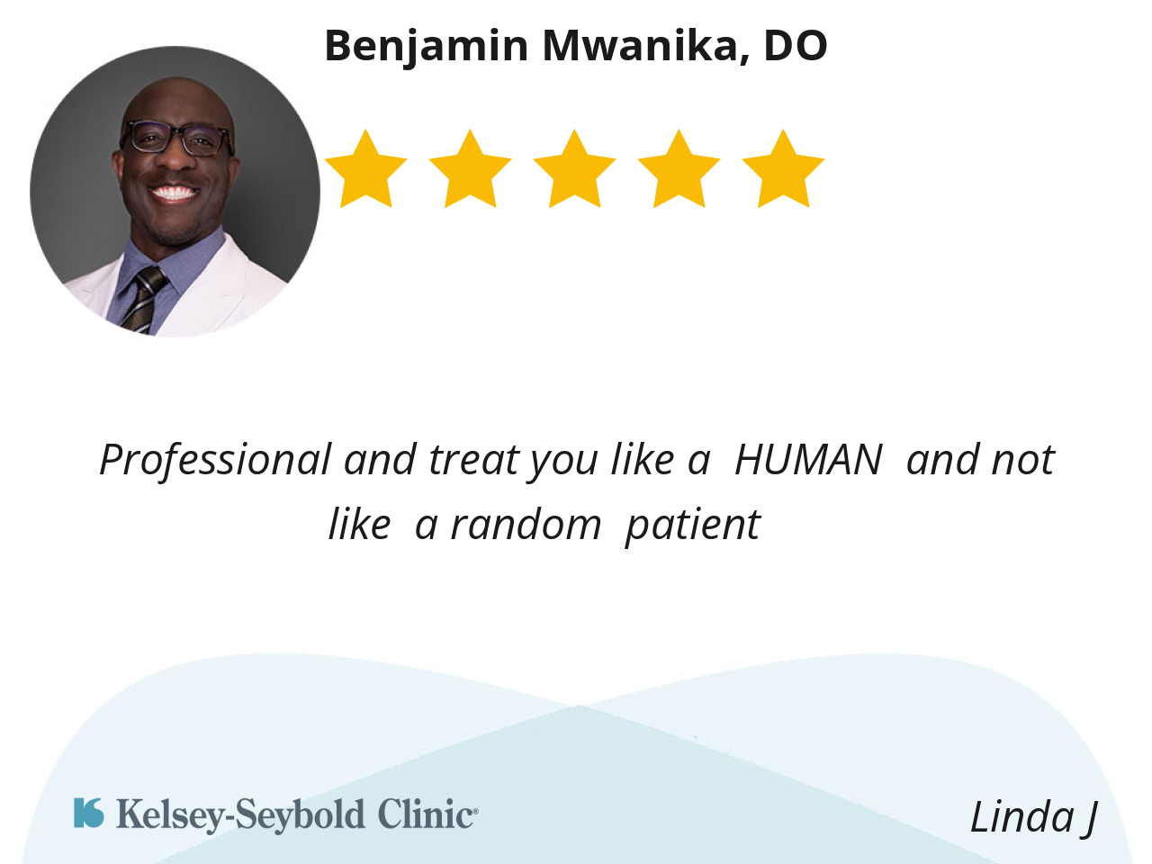 Dr. Benjamin Mwanika is so nice and professional. His energy and is always pleasant. He take his time and go over everything without making you feel rushed. He's very thorough.