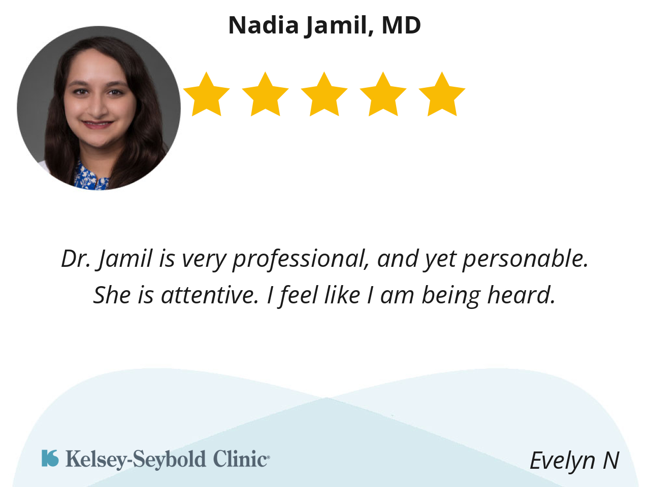 Dr. Jamil is very professional, and yet personable. She is attentive. I feel like I am being heard.