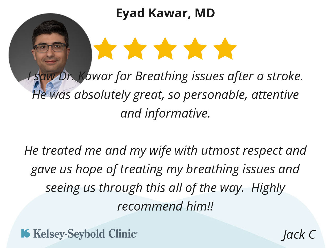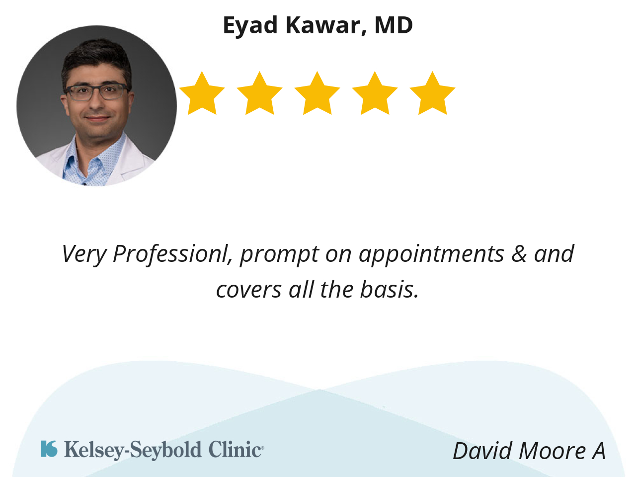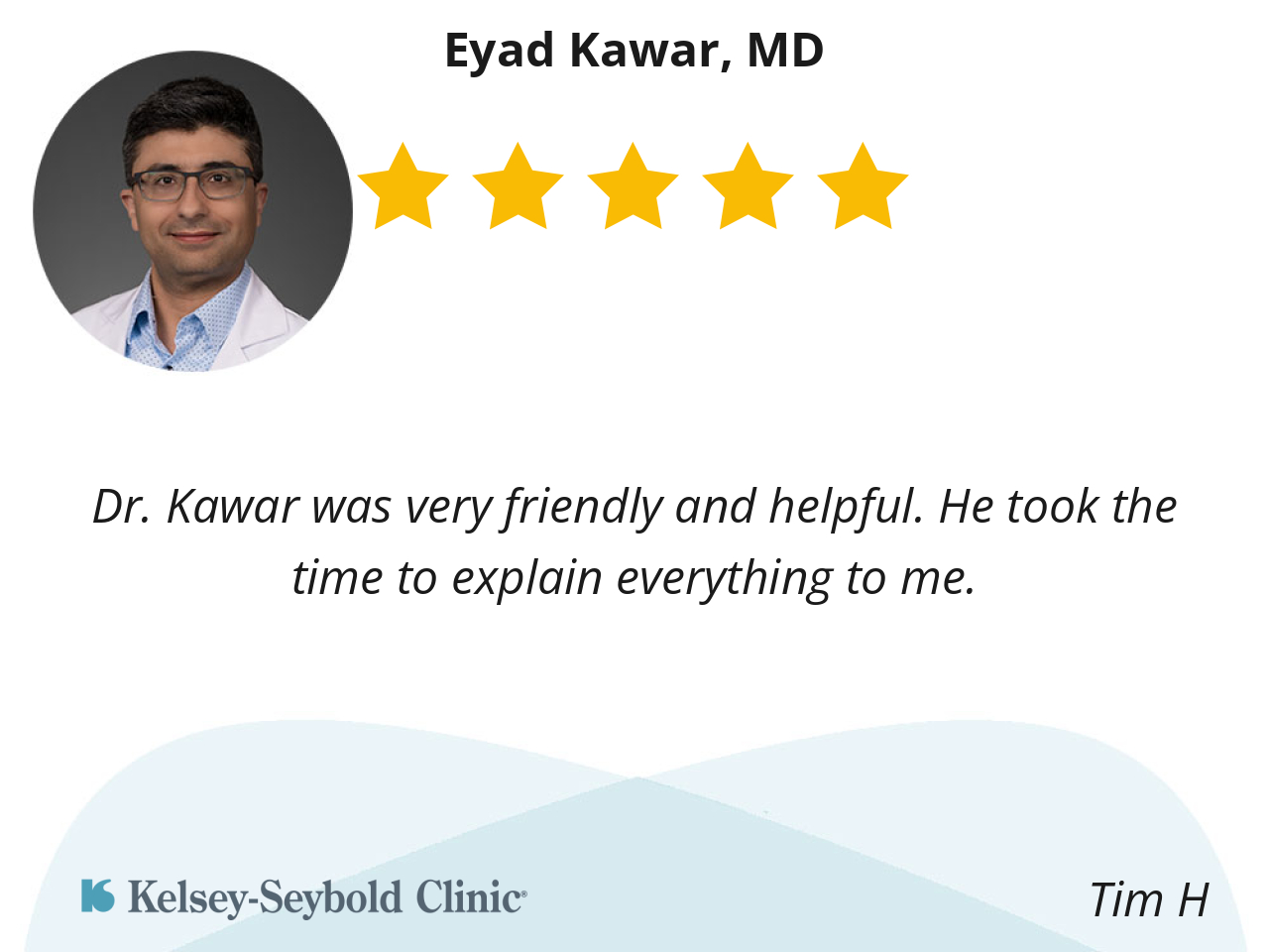 Dr. Kawar is thorough and knowledgeable. I am glad he is with Kelsey Seybold.