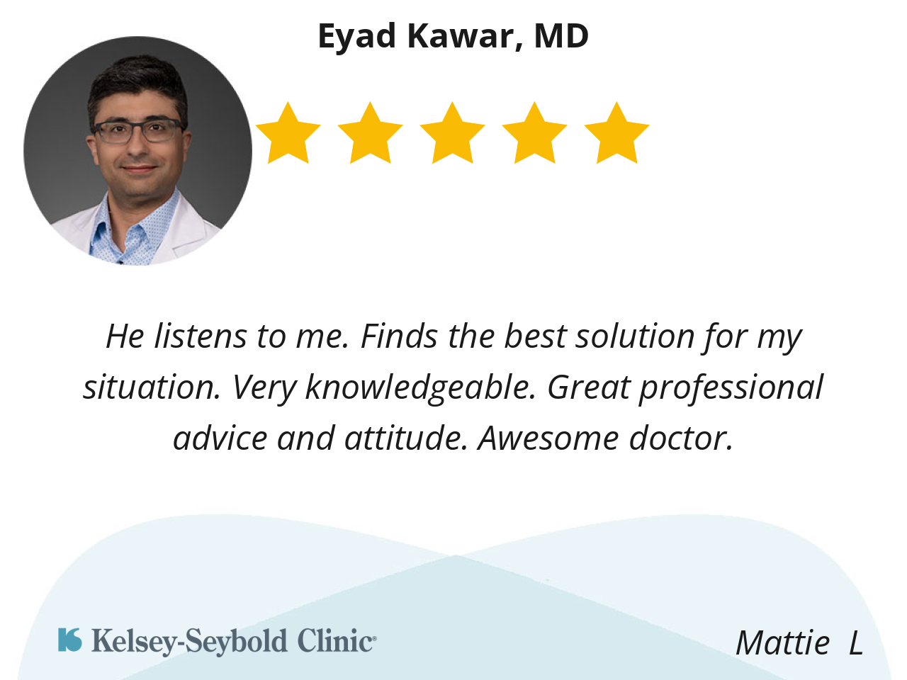 Dr. Kawar is one my most favorite doctors. He is the best pulmonary doctor I ever had and he is crucial to my health care. I breathe better when sleeping which in turn allows my body to heal and rest.