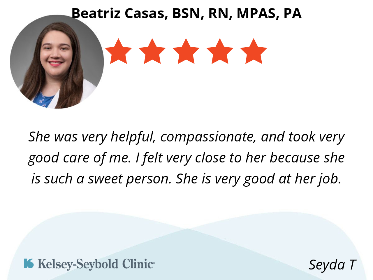 She was very helpful, compassionate, and took very good care of me. I felt very close to her because she is such a sweet person. She is very good at her job.