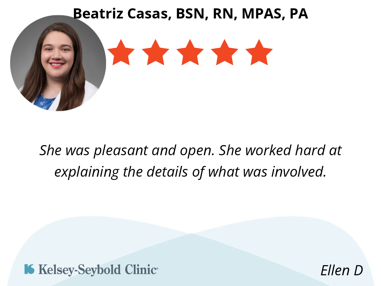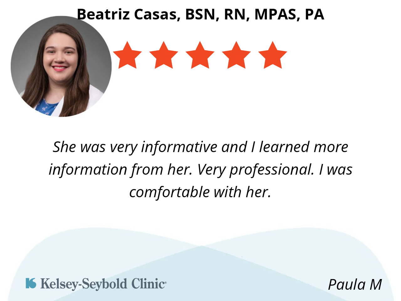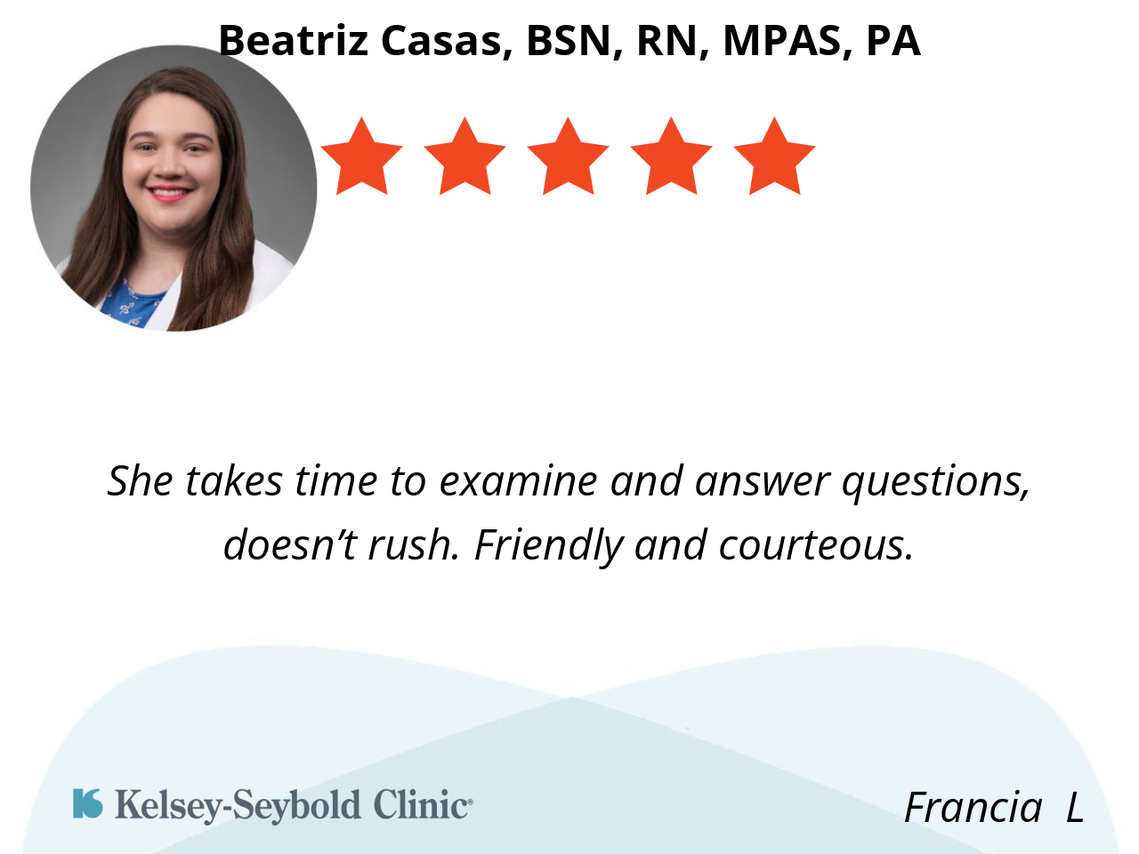 She takes time to examine and answer questions, doesn’t rush. Friendly and courteous.
