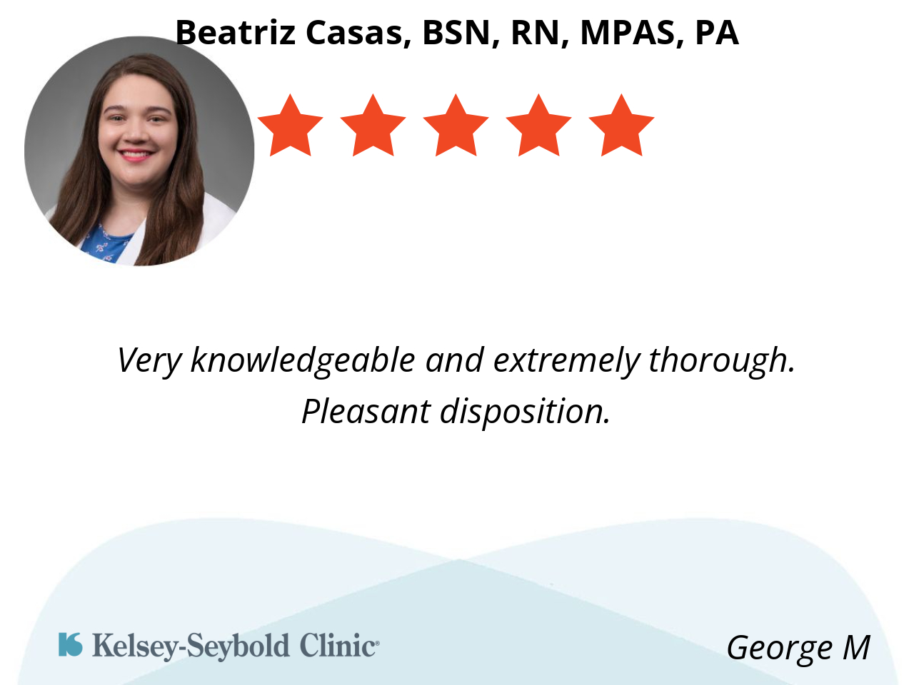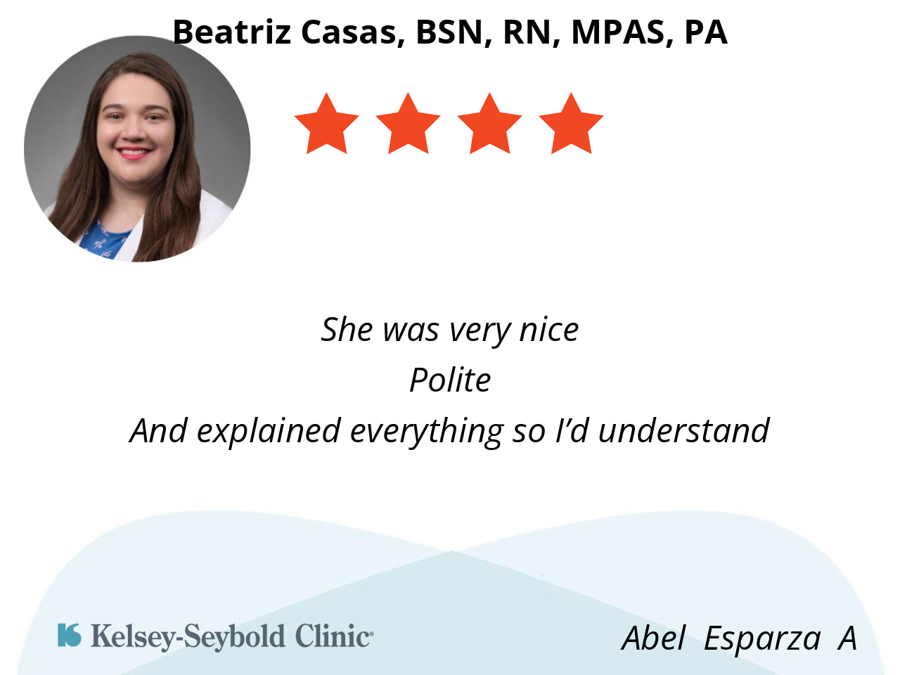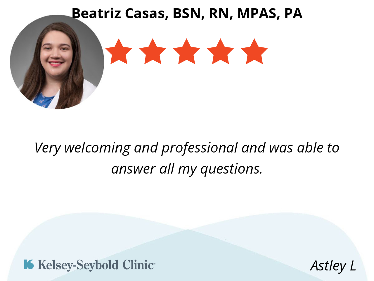 She takes time to examine and answer questions, doesn’t rush. Friendly and courteous.