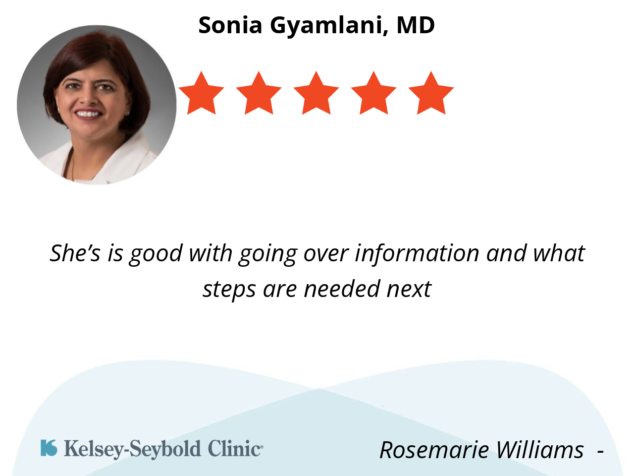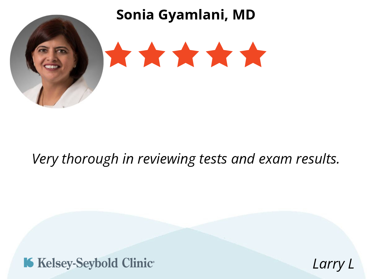 Dr Gyamlani was very thorough as well as personable. She took time to answer my questions and make referrals necessary.