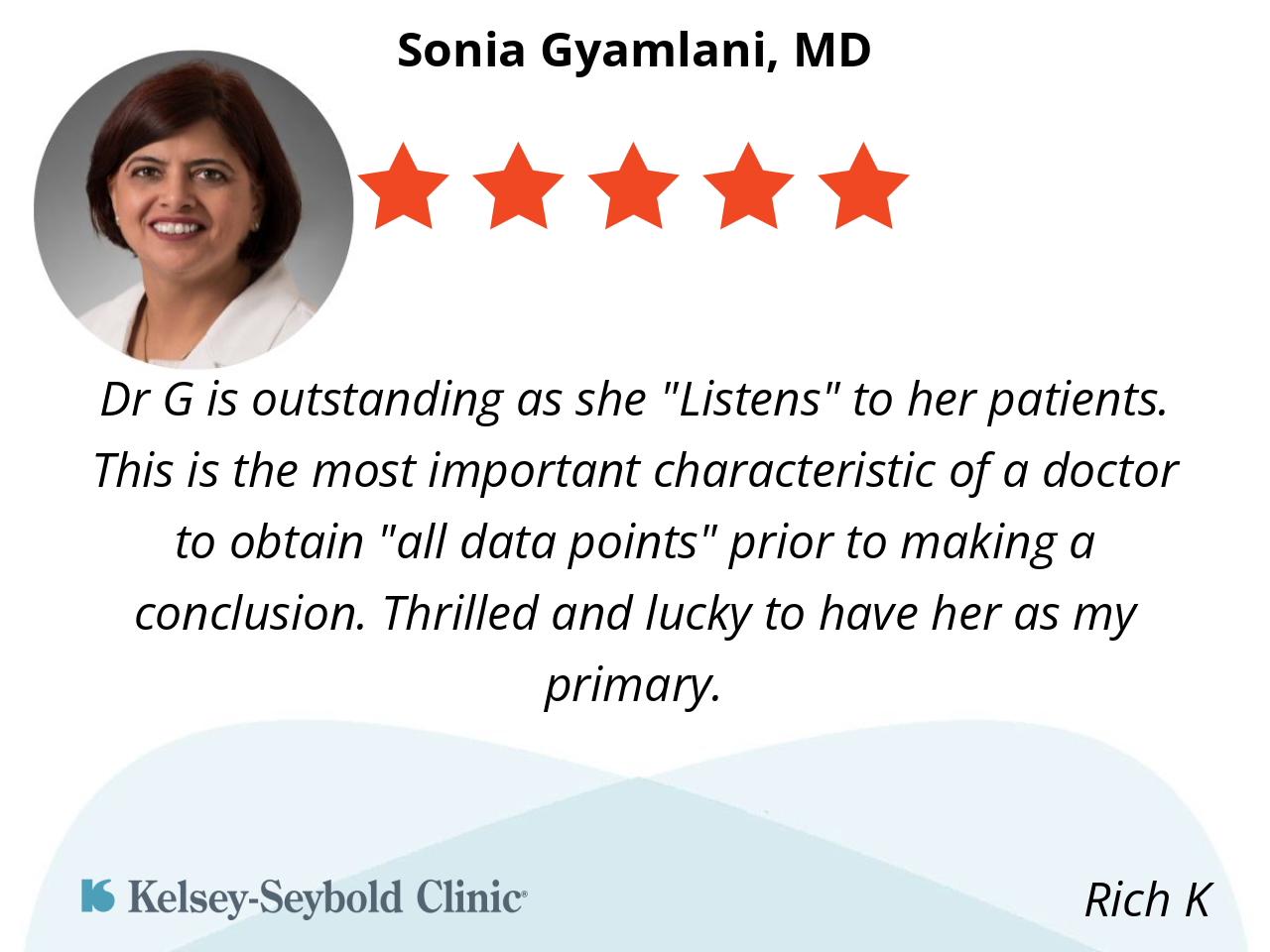 Dr G is outstanding as she "Listens" to her patients. This is the most important characteristic of a doctor to obtain "all data points" prior to making a conclusion. Thrilled and lucky to have her as my primary.
