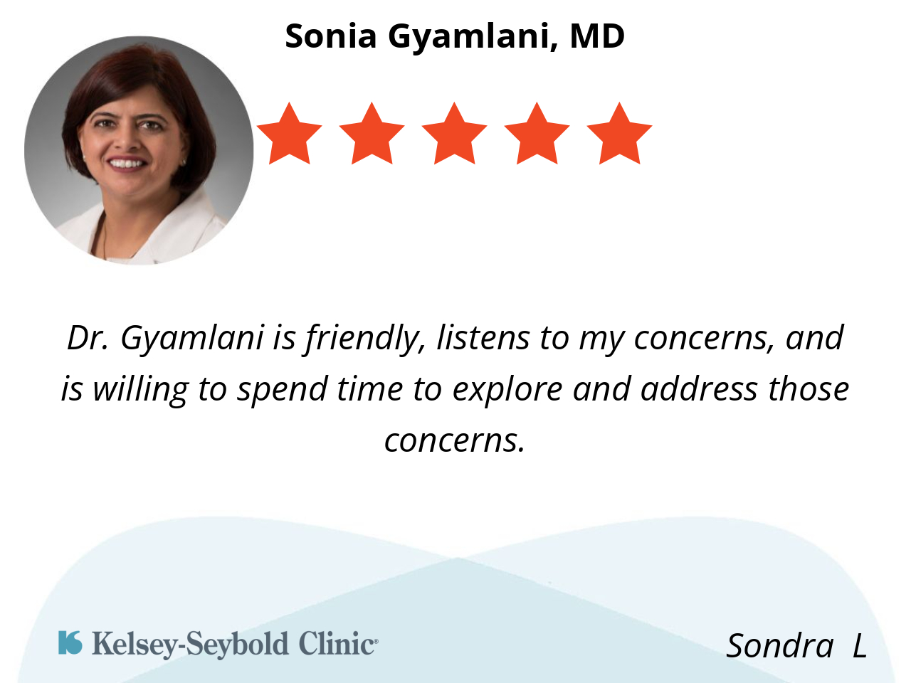 Dr. Gyamlani is friendly, listens to my concerns, and is willing to spend time to explore and address those concerns.