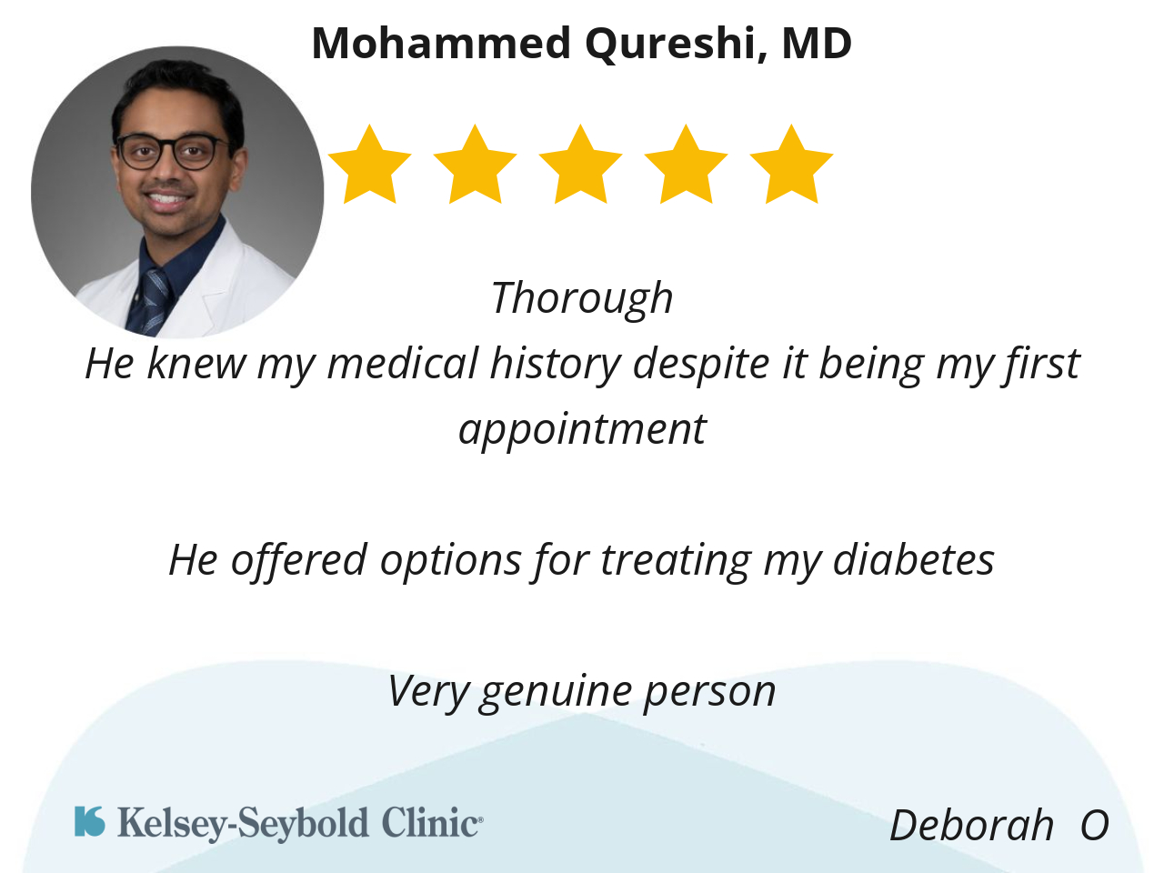 This was my first visit with Dr. Qureshi (not my first endocrinologist), and I believe I could not have picked a more capable doctor. He spent a good amount of time explaining to me charts and graphs and information about my condition that no one else had. He intently listened to my opinions which we then discussed (whether he agreed with them or not!). Dr. Qureshi is the first doctor of any kind that I met with in a long time who didn’t spend more time typing into his computer than actually conversing with me. He is also obviously very knowledgeable and personable, with a top-notch staff. I highly recommend him.