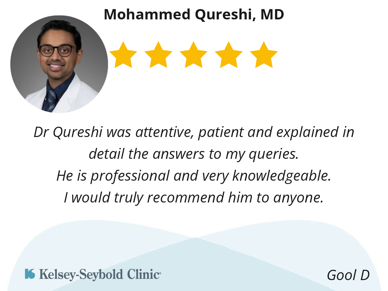 Dr. Qureshi takes the time to thoroughly explain everything to me. He gives me treatment options and then helps me to make the best treatment choice.