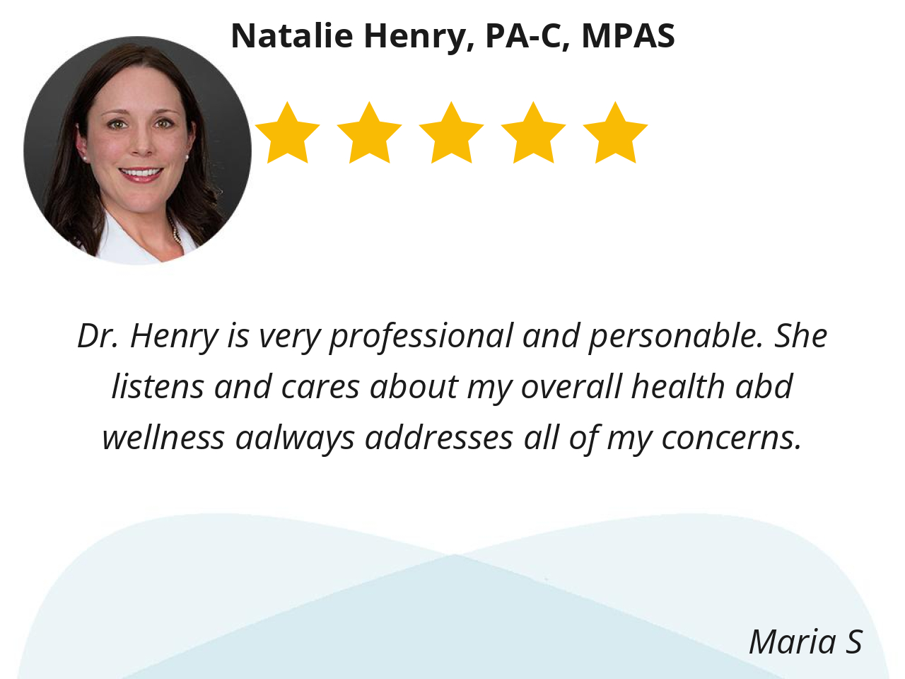 Dr. Henry is very professional and personable. She listens and cares about my overall health abd wellness aalways addresses all of my concerns.