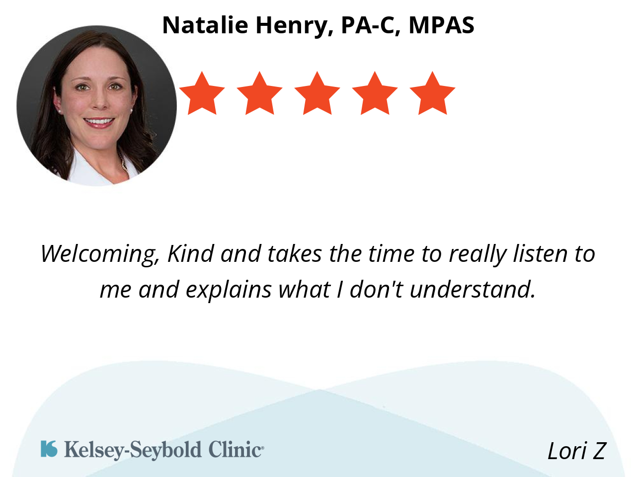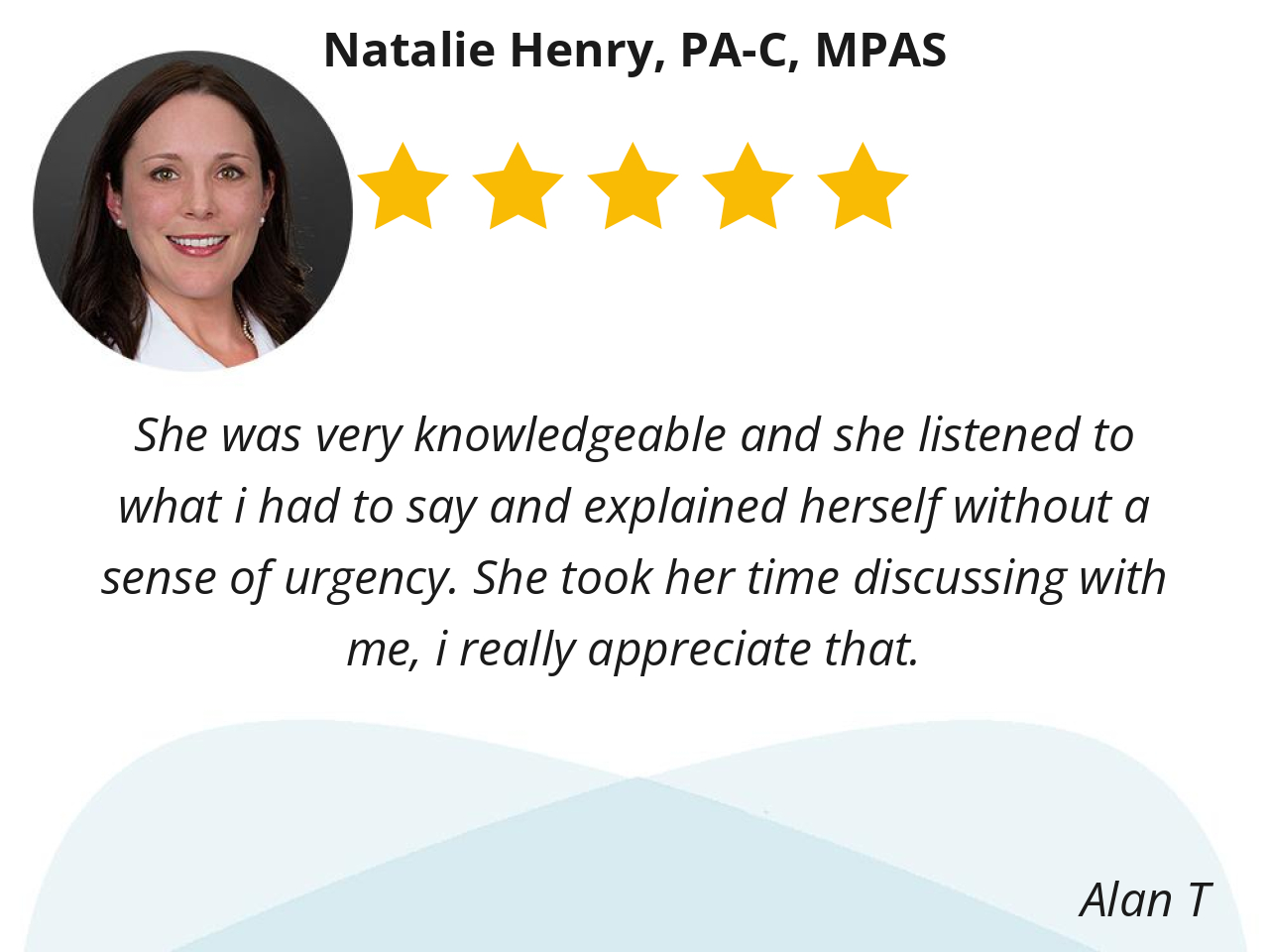 Natalie Henry is amazing! She truly listens to any concerns I have and we talk about the best course of action for me. Natalie truly cares.