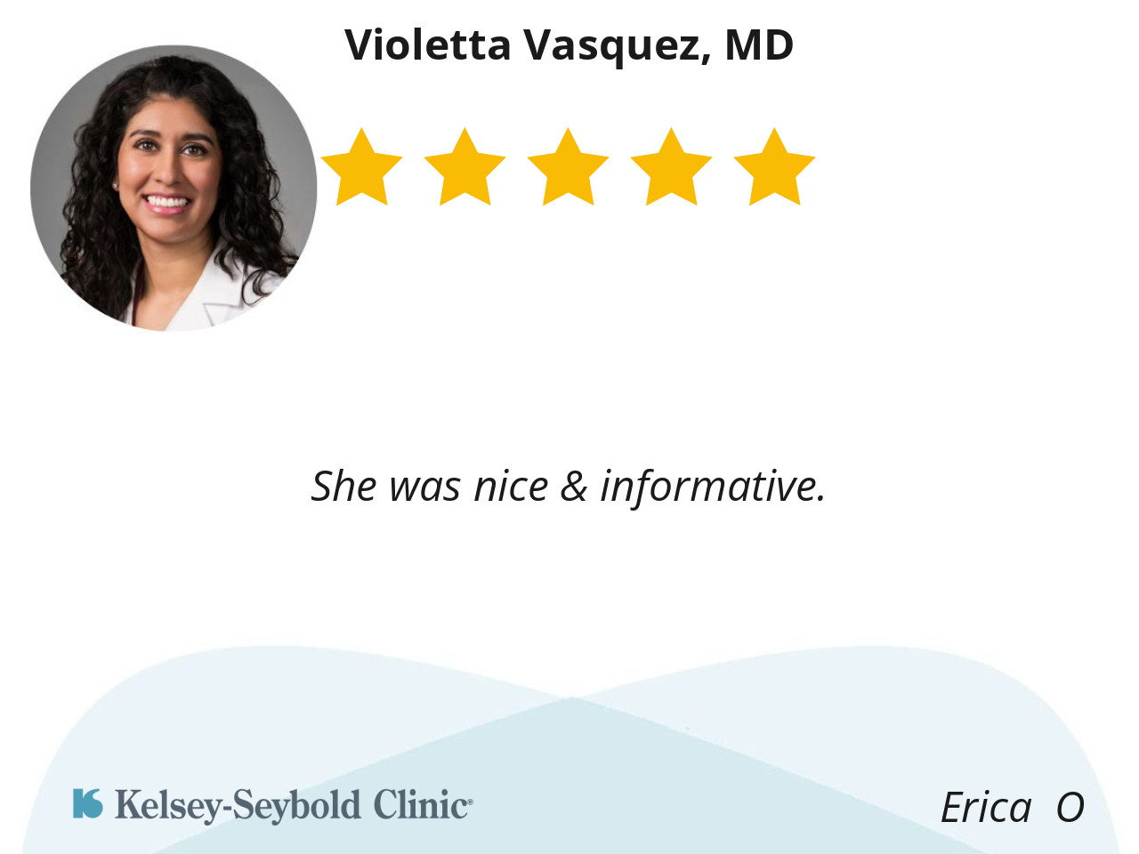 Dr Vasquez is knowledgeable, pleasant and caring. She showed me her professionalism and interest in my case. Thank you Dr. Vasquez.