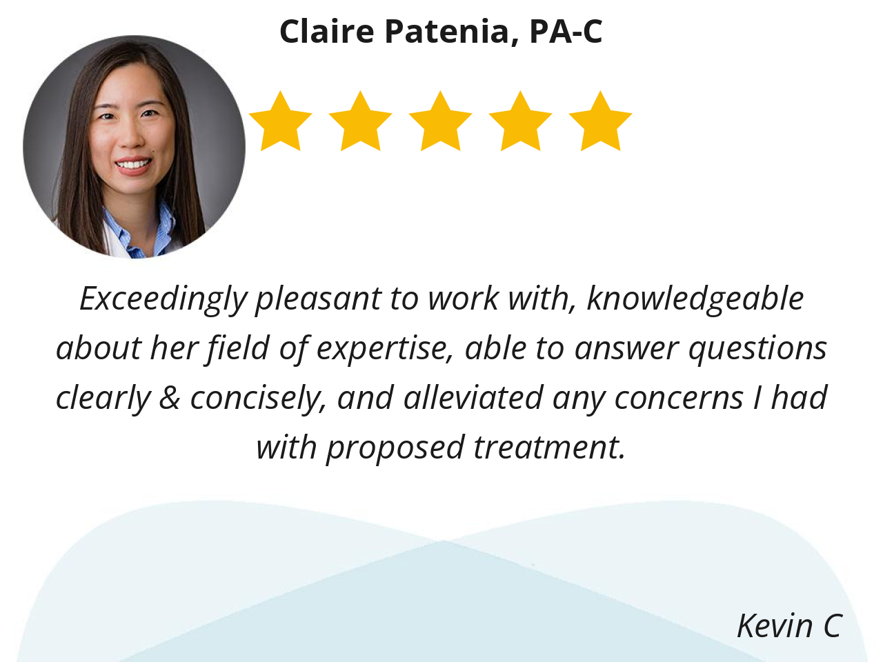 Dr. Claire was very well spoken and good at explaining the situation. Answered all my questions and was very reassuring.